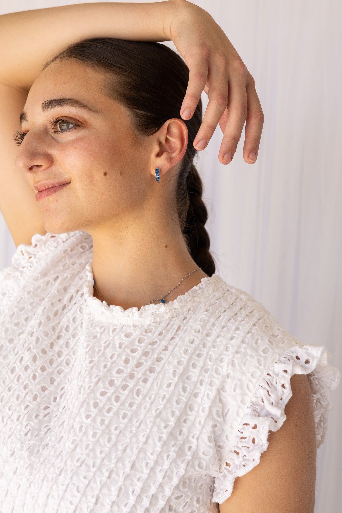 Meet the Diamond Hoops! She is like, an instant obsession, right!? The size of the hoop is just absolutely perfect and I am obsessed with the gorgeous shade of blue those cubic zirconia crystals are! Whether you wear it alone, or stack it with some other studs or hoops (if you have multiple piercings) you seriously cannot go wrong with this super eye catching hoop!