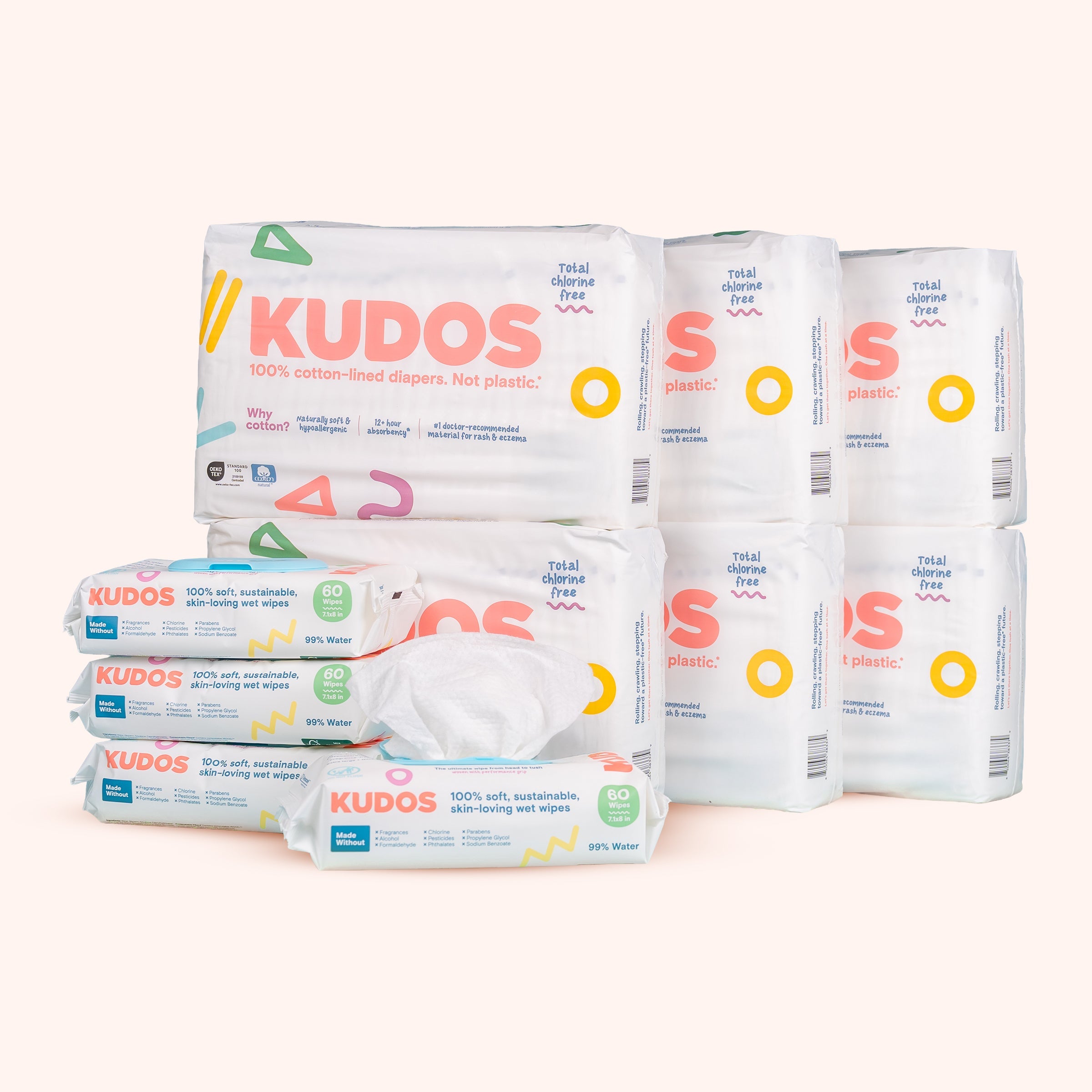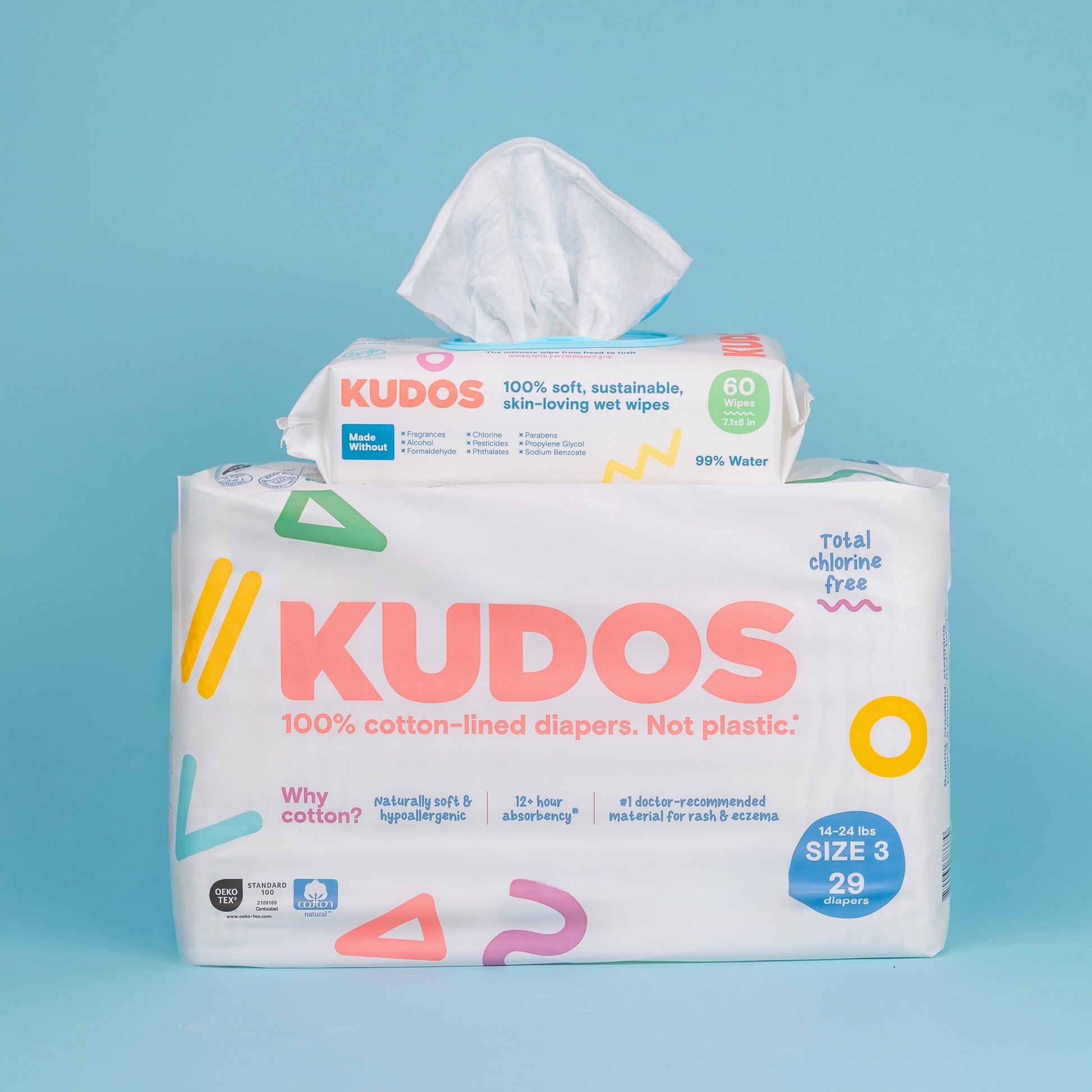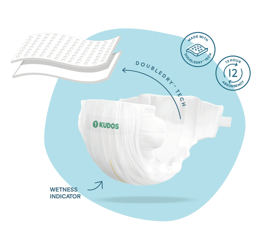Our premium disposable diapers are the only diapers on the market lined with 100% cotton, perfect for sensitive skin. Made from U.S.-sourced cotton that’s dry processed without water, chemicals, or heat, Kudos diapers are Total Chlorine Free, OEKO-TEX® STANDARD 100 certified, and free from lotions, fragrances, latex, parabens, phthalates, and chlorine. Our award-winning DoubleDry™ technology features two absorbent layers for up to 12+ hours of leak protection, day and night.