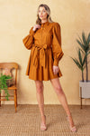 A solid woven mini dress featuring shirt collar, button down, long sleeve with cuff, elasticized waist, self sash tie and full skirt