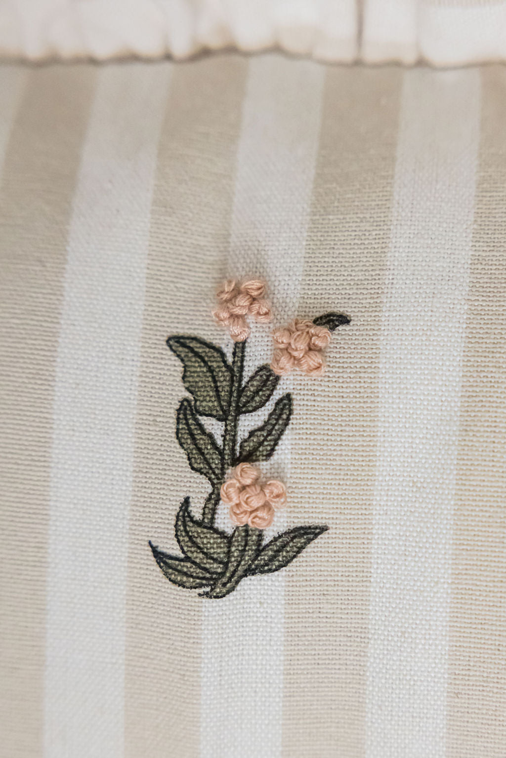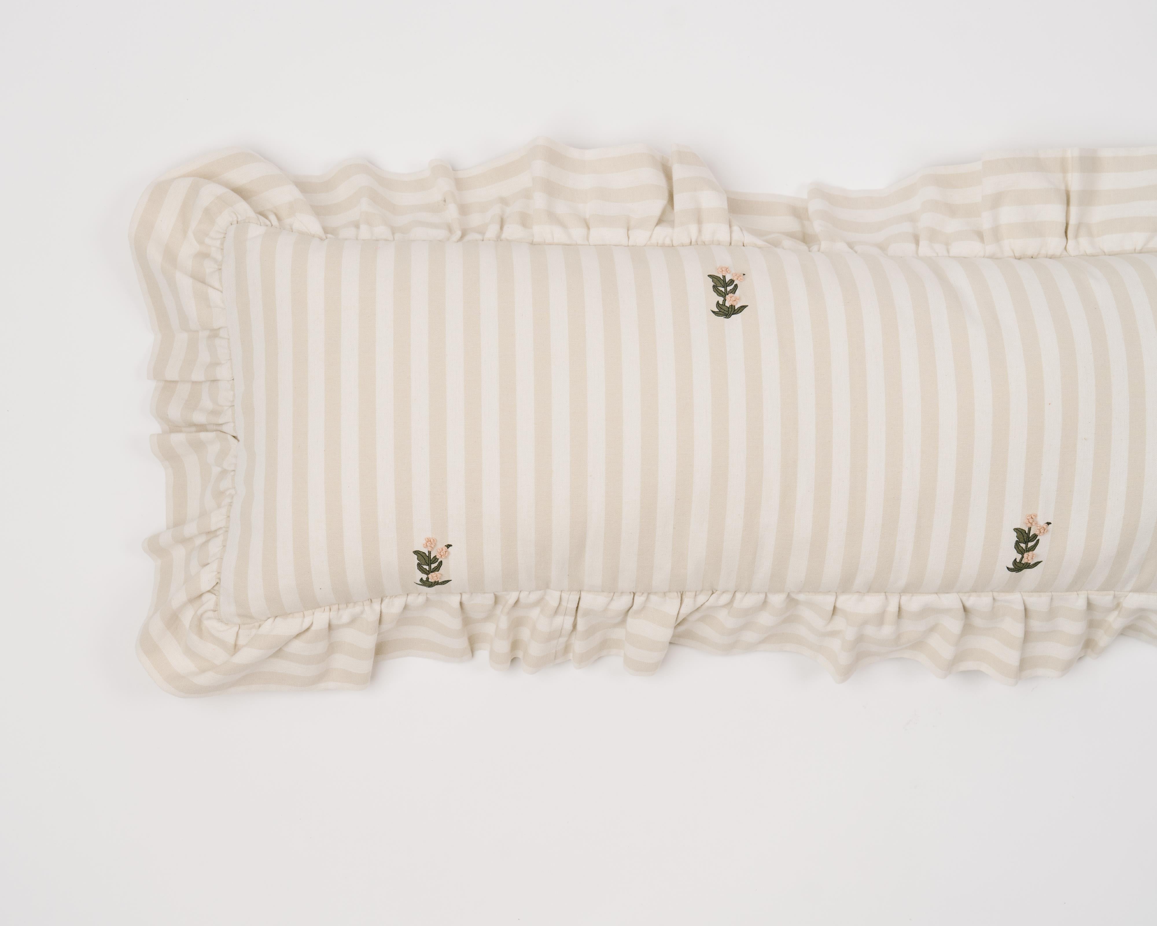 Our uniquely designed lumbar pillow is made from high quality 100% cotton. Featuring beige and cream stripes, a flirty ruffle, and embroidered flowers, this collection puts a twist on a traditional pattern.