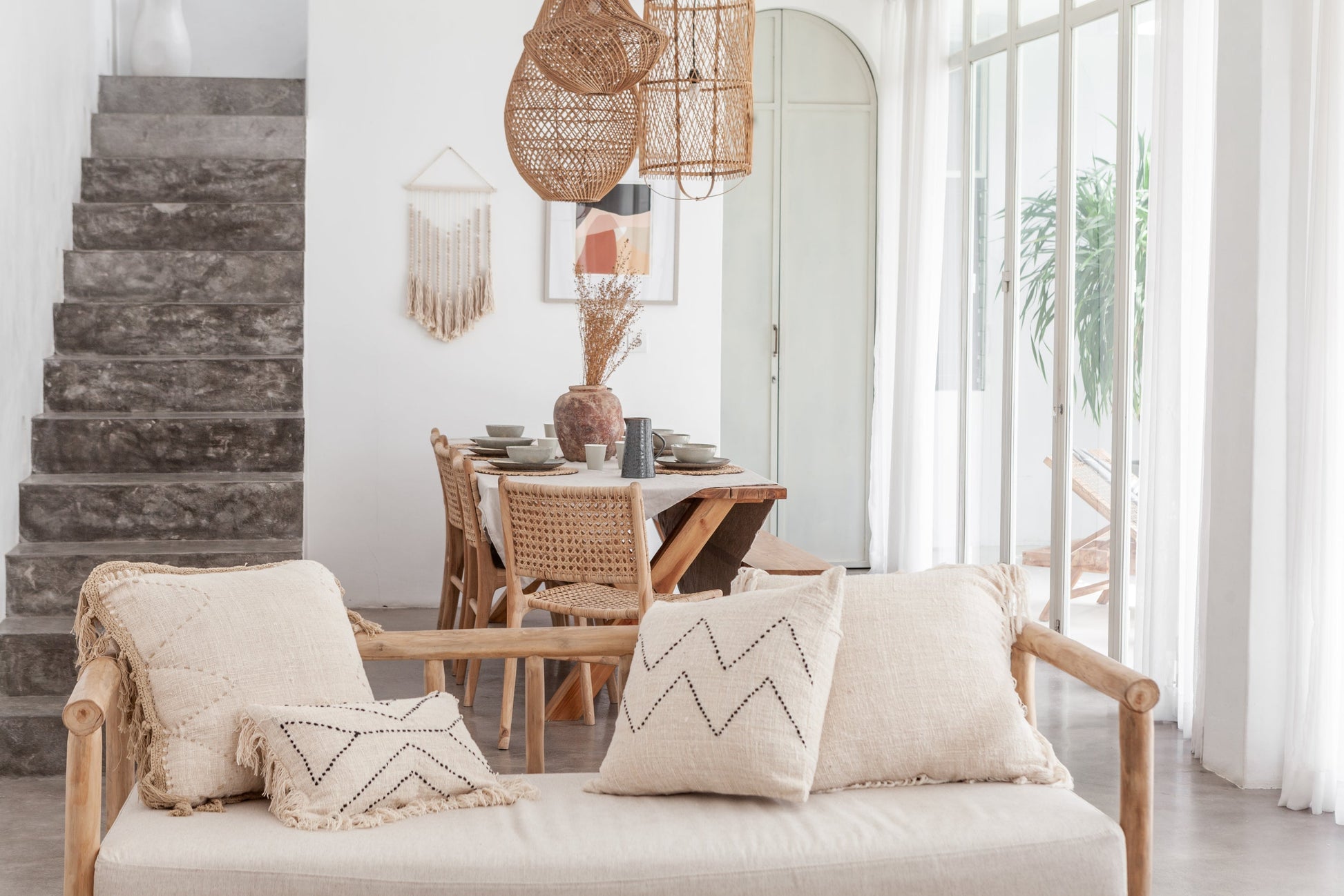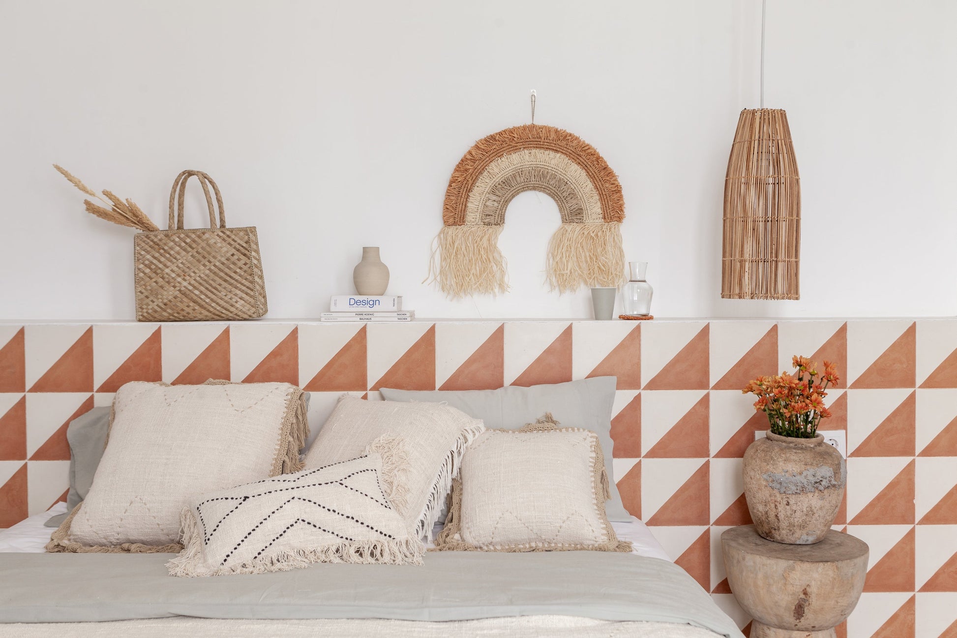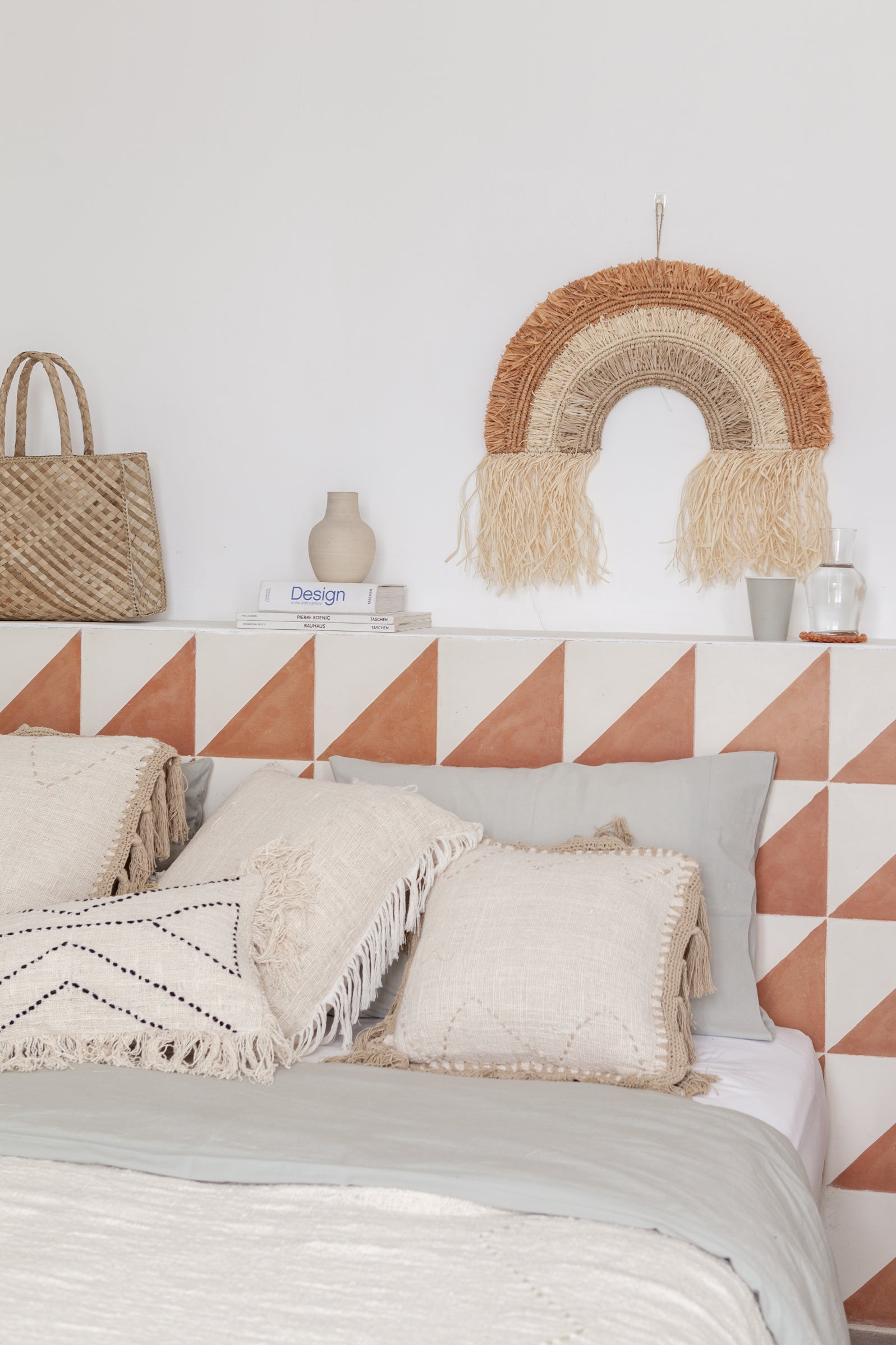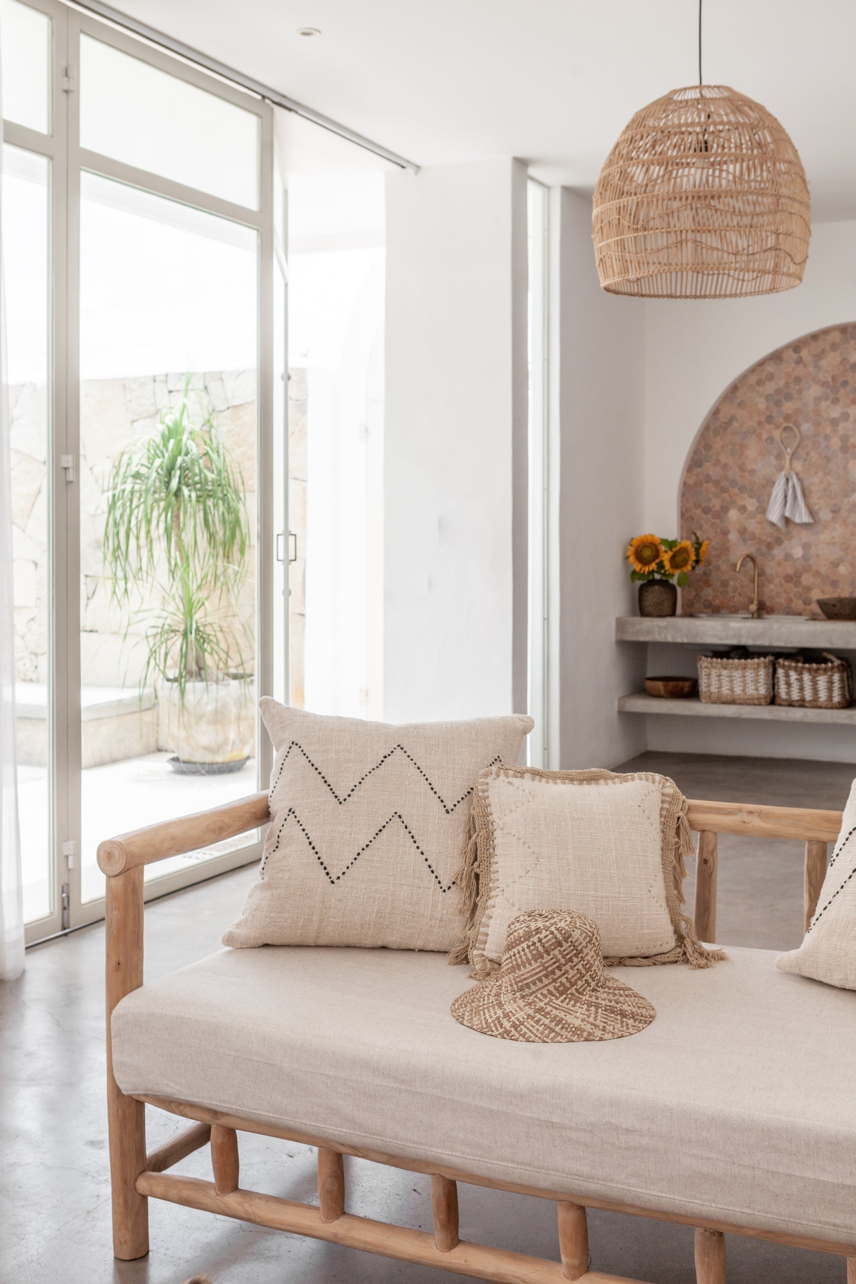 Made from organic hand spun cotton, hand woven and hand stitched with attention to detail. Fill your home with texture and warmth with our Gaia throw pillow, featuring a muted gold zig zag pattern with gold tassels, available in three sizes.
