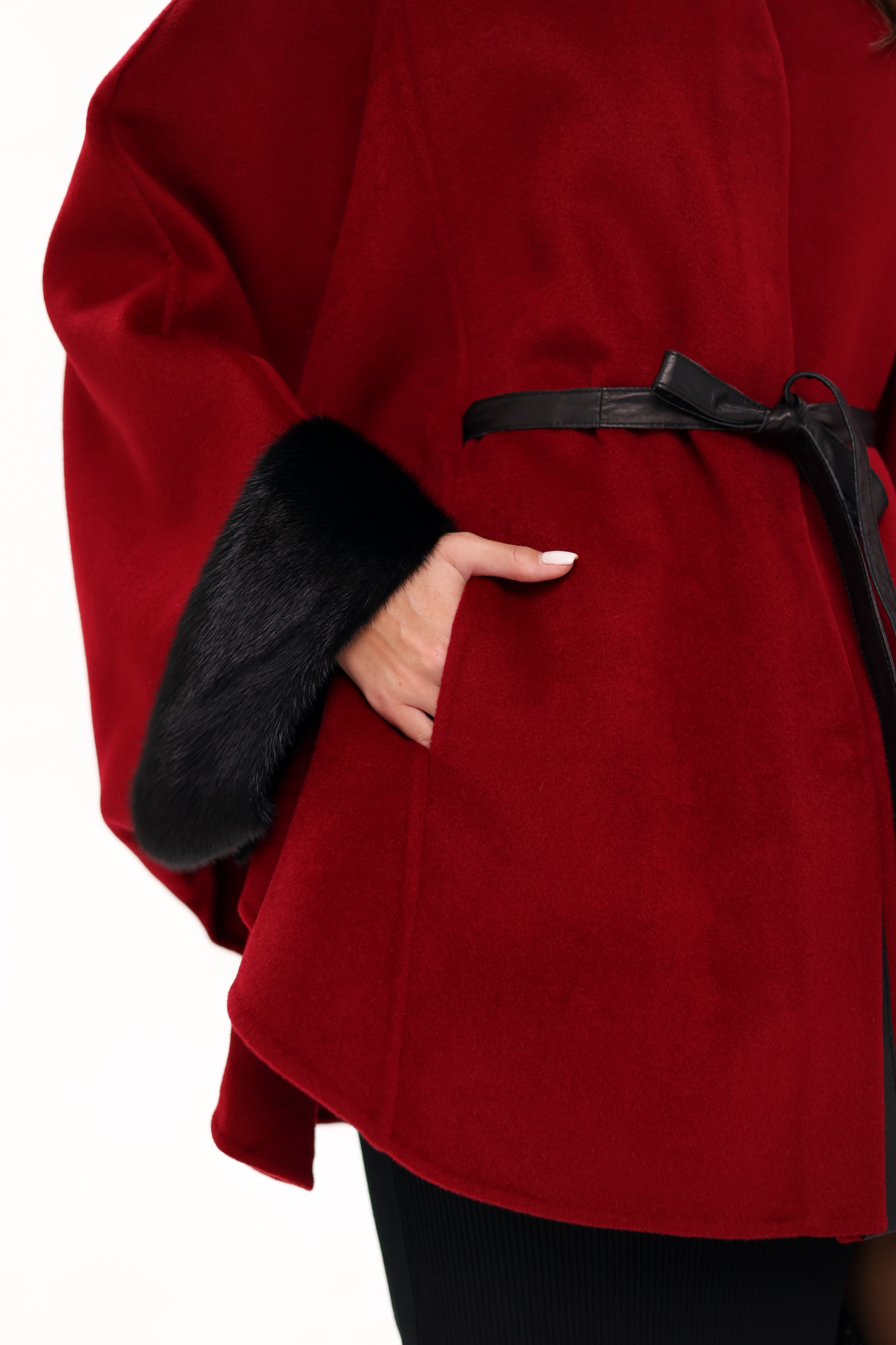 Crowned with a genuine Scandinavian fur trim collar, this pure wool poncho coat  exudes sophistication and is accented by luxe leather belt. Premium quality double face virgin wool, once reserved for royalty, makes this coat solid addition to your wardrobe. And the Scandinavian Mink fur trim adds stunning contrast of texture and tone. Finished with a flattering, free-fitting cut, this premium coat is the one you’ll treasure.