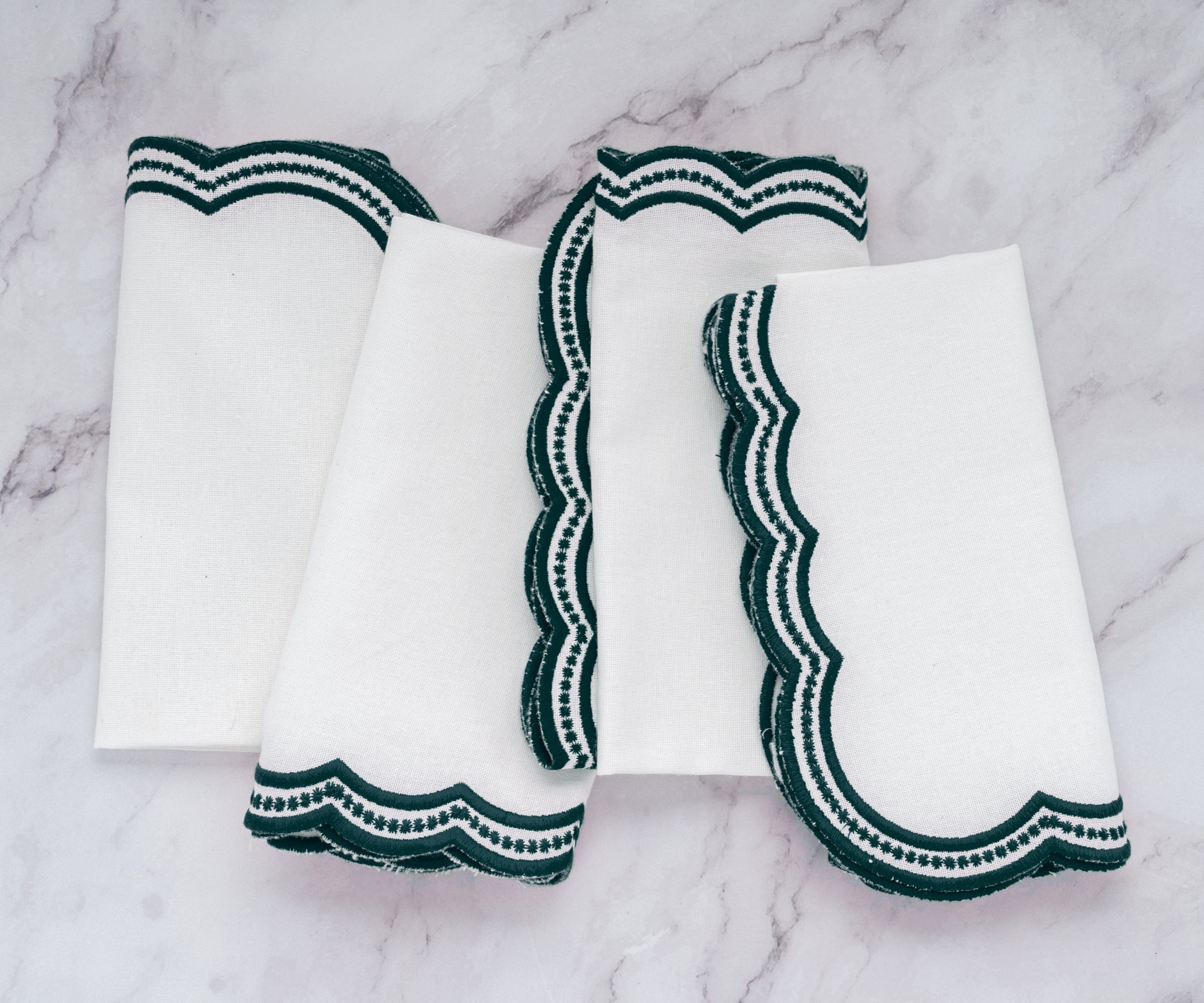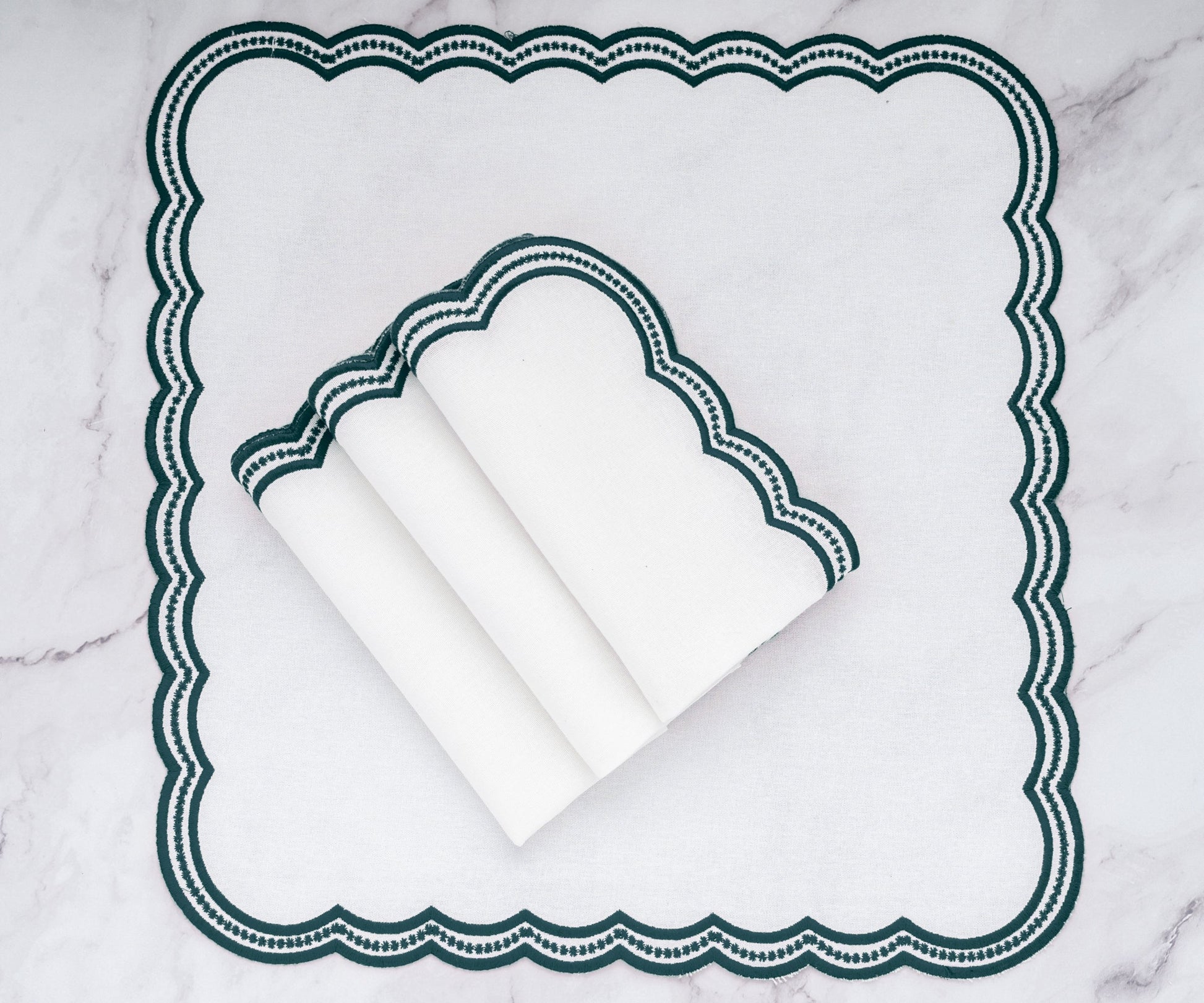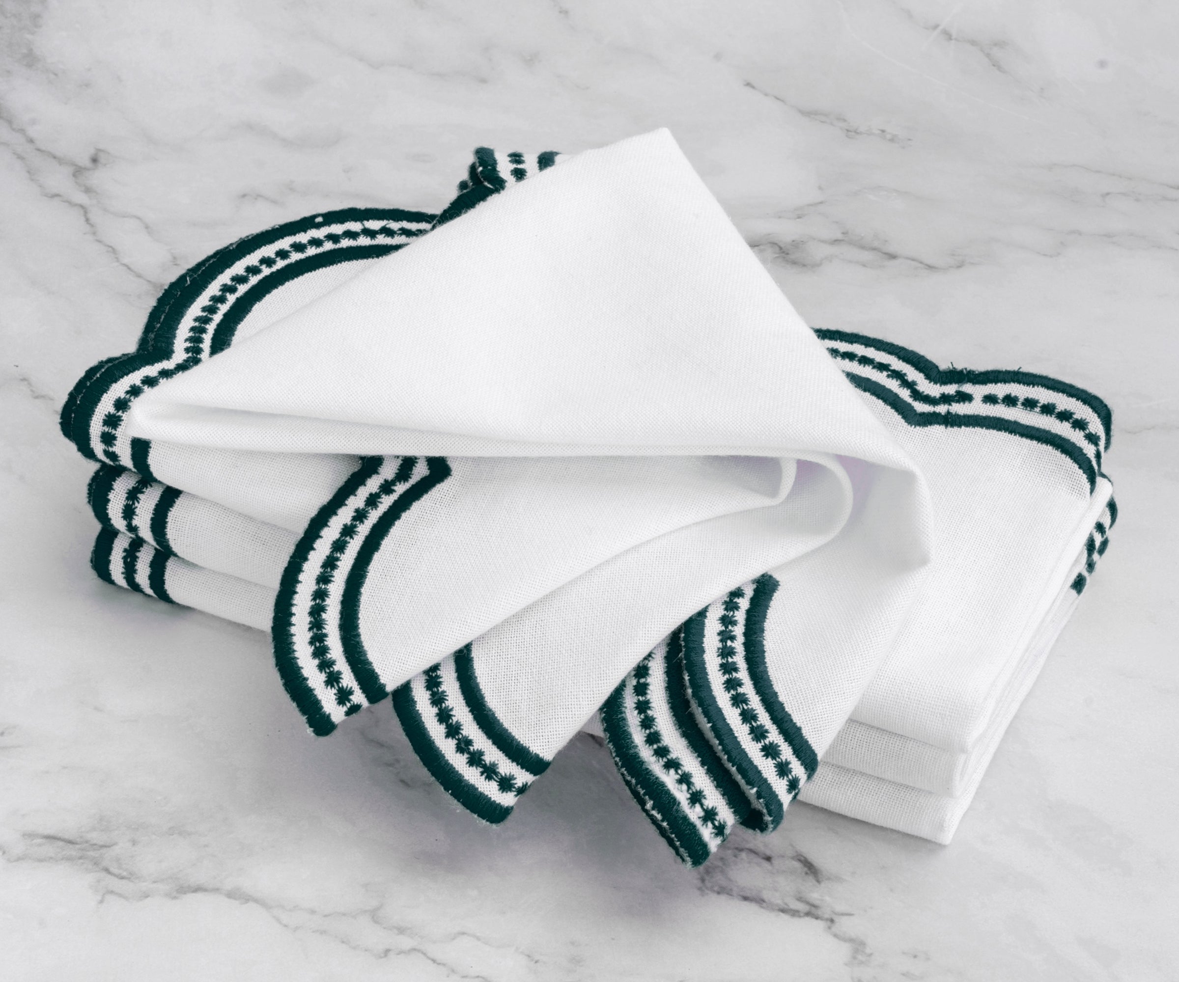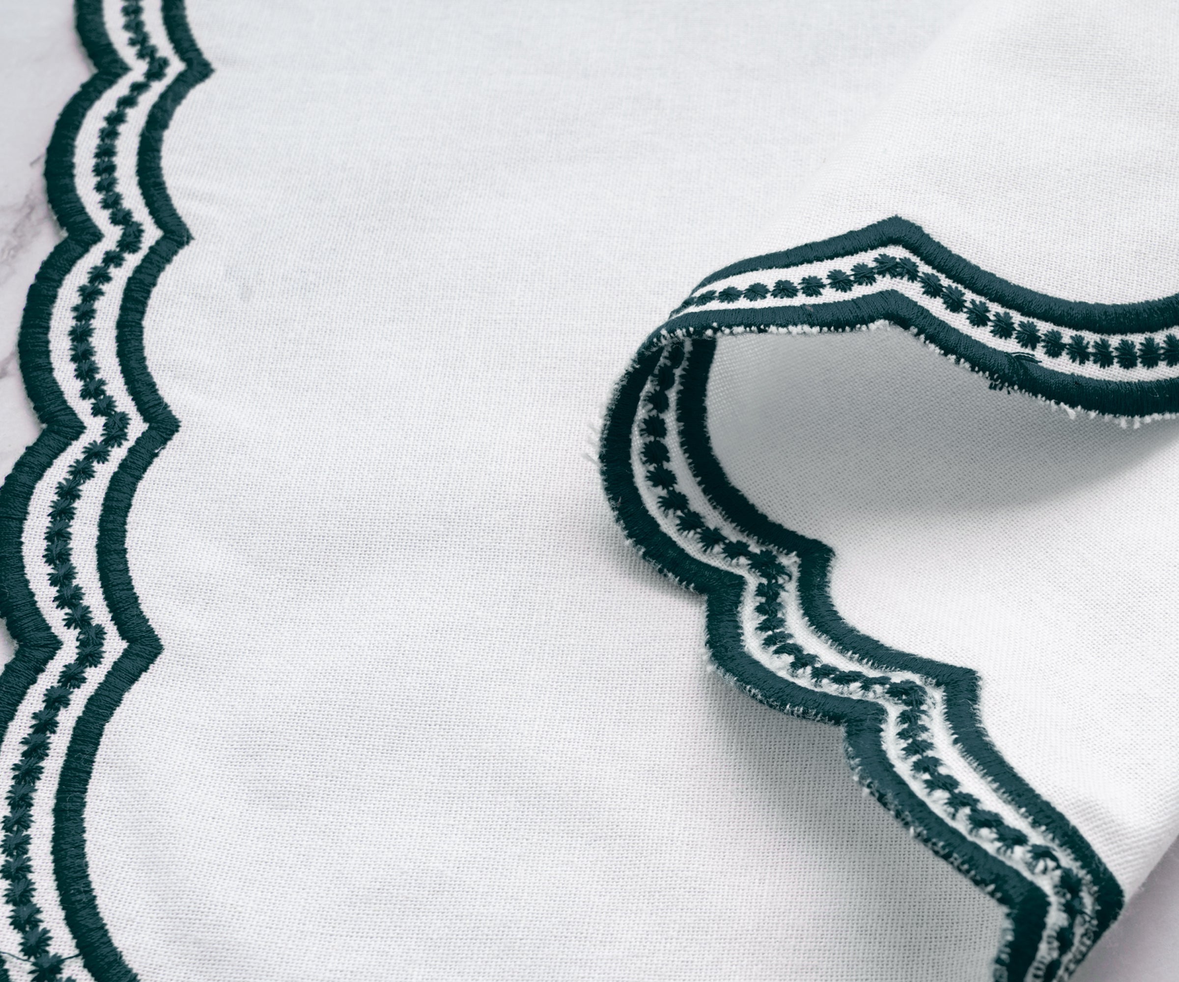 Add a touch of elegance to your table with our Green Scalloped Embroidered Napkins. Made from 100% cotton, these scalloped napkins feature a crisp white base with intricate green scalloped embroidery, offering a sophisticated and timeless design. Soft, absorbent, and durable, they are perfect for weddings, dinner parties, and everyday dining.
