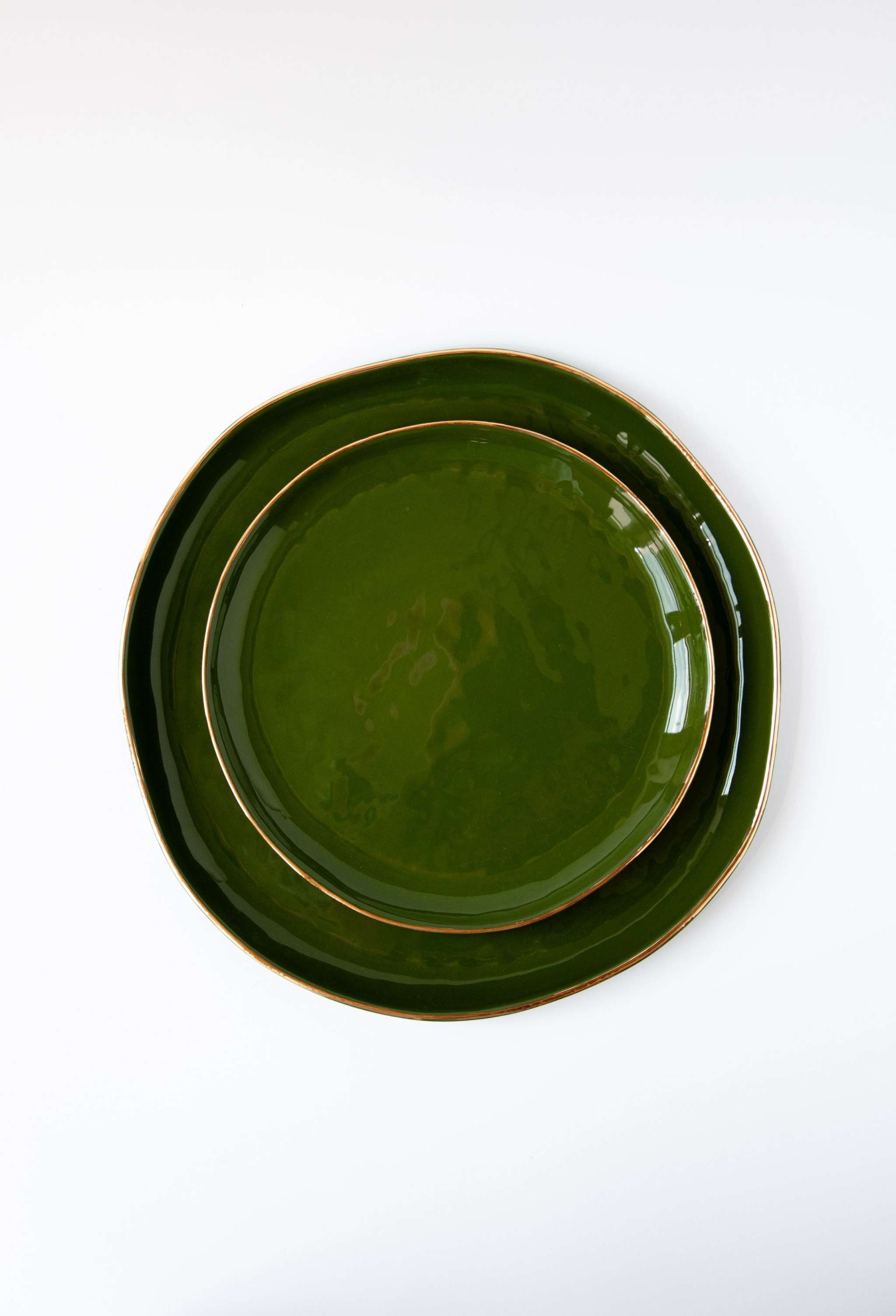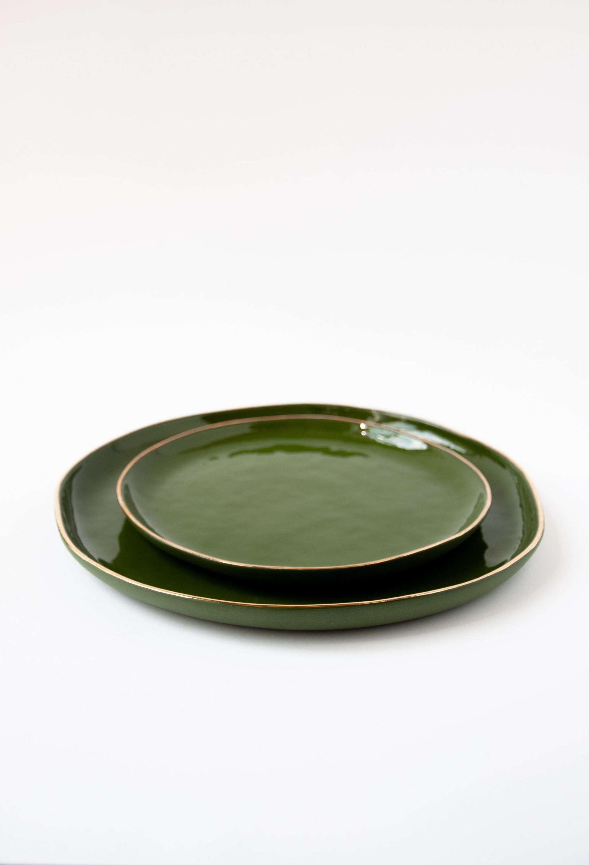 Handmade Porcelain Dinner Plates with Gold Rim. Green