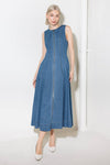 A washed denim midi dress featuring round neckline, sleeveless and front zipper closure.
