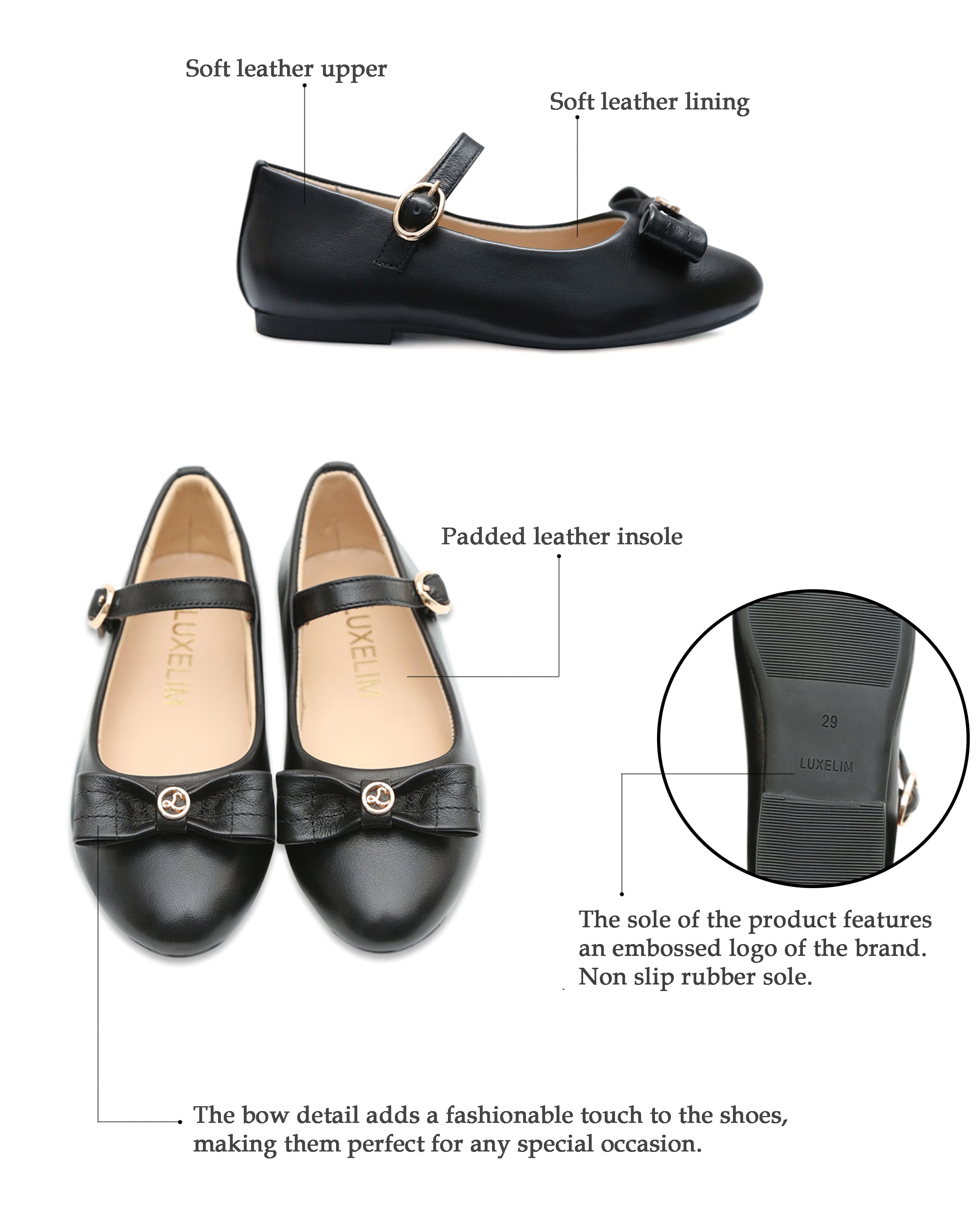 These adorable shoes are the perfect combination of style and comfort. The soft leather upper and lining, along with the padded insole provide a comfortable fit. The bow detail adds a fashionable touch to the shoes, making them perfect for any special occasion.