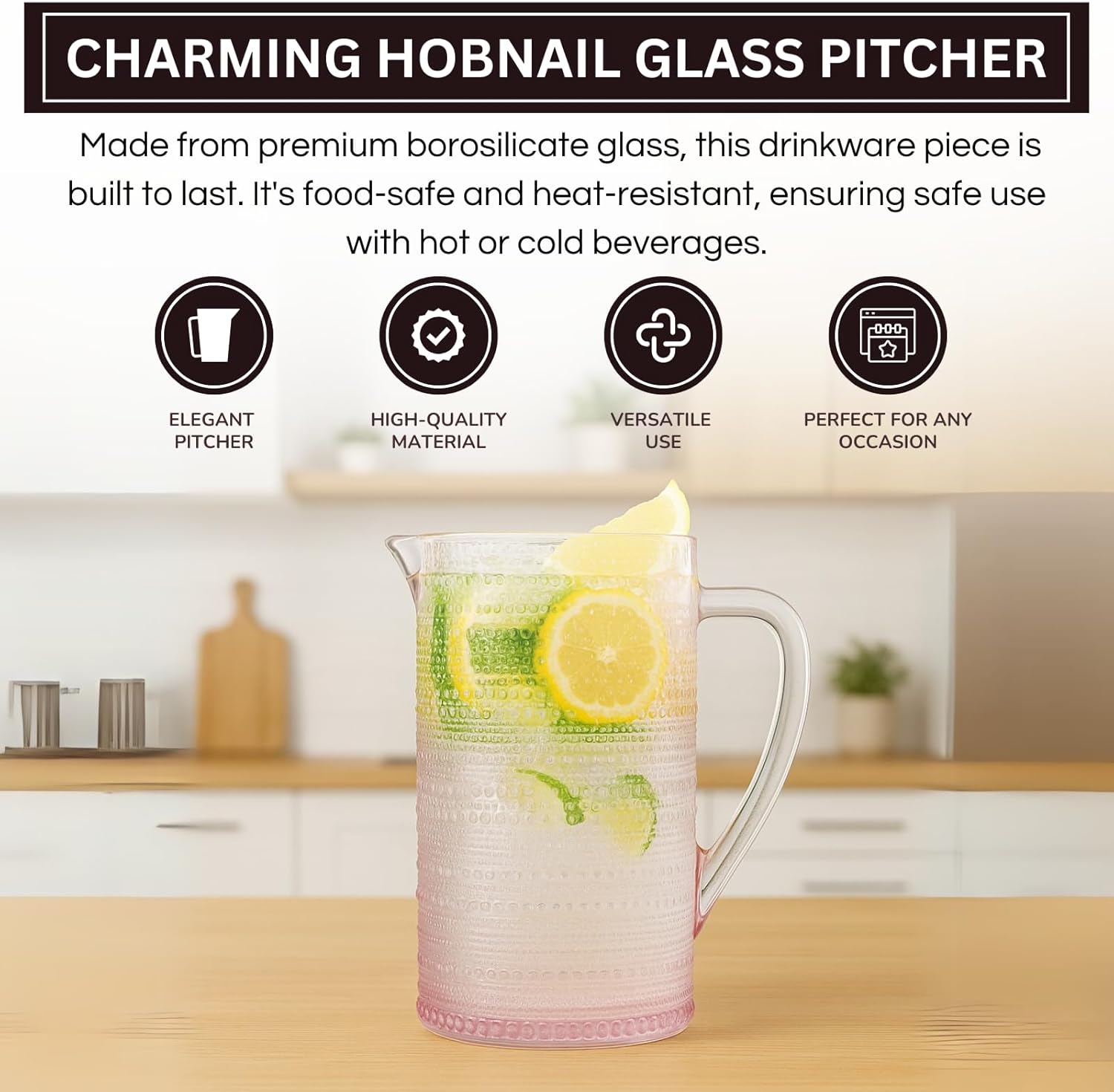 Khen Hobnail Pitcher, Vintage Style Textured Artisan Design Borosilicate Glass Beverage Server Drinkware - 7.8 Inch Pink