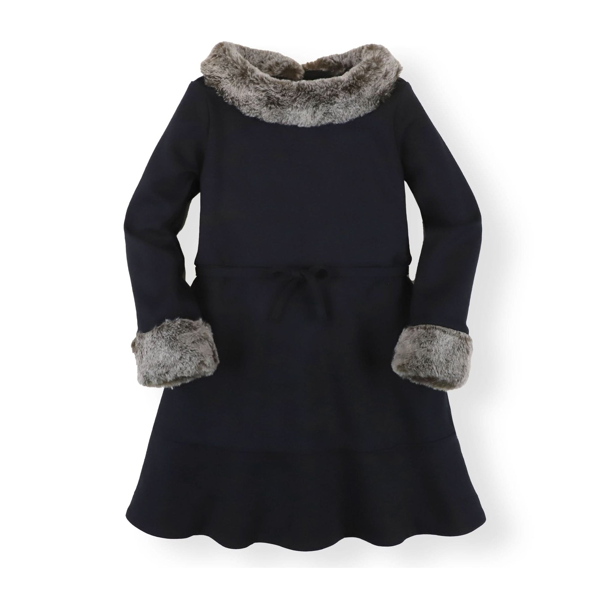 She'll be ready to twirl through the holidays in our soft organic cotton ponte fit and flare skater dress. Features festive faux fur cuffs and collar, cap sleeves, a flounced skirt, a waist tie, and a back zip closure for easy dressing. Long sleeves keep her cozy and warm.