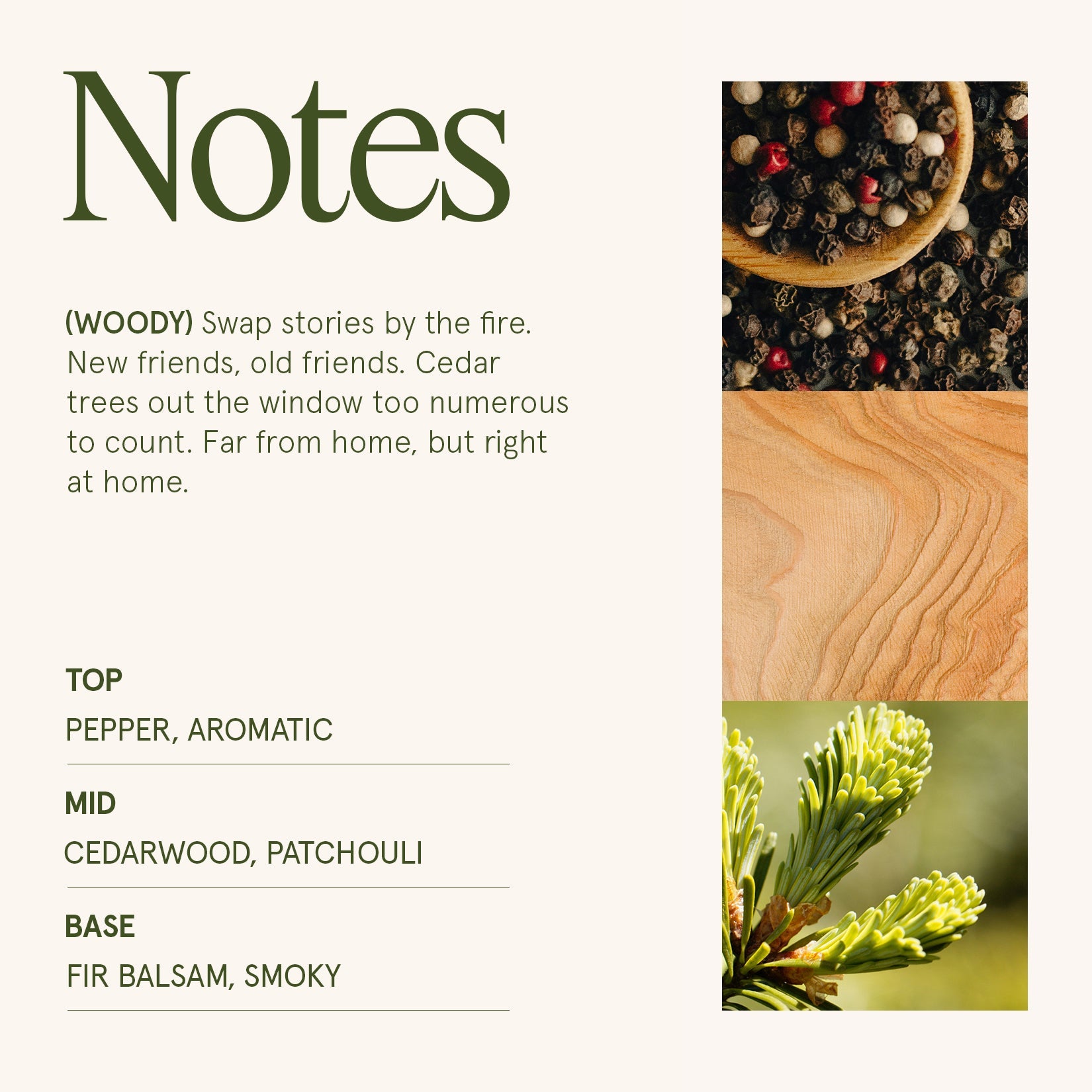 Crisp mountain air laced with refreshing cedar wood and earthy patchouli, then deepens into a forest of fir balsam, kissed by a wisp of campfire smoke. A reminiscent of a holiday family gathering under the evergreen conifer.