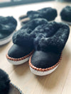 Woollen interior keeps feet cosy and dry due to sheepskin thermostatic attributes. Outer sole is made out of genuine leather with a fluffy fur cuff around the top. Slippers are hypoallergenic and ideal as work from home shoes.