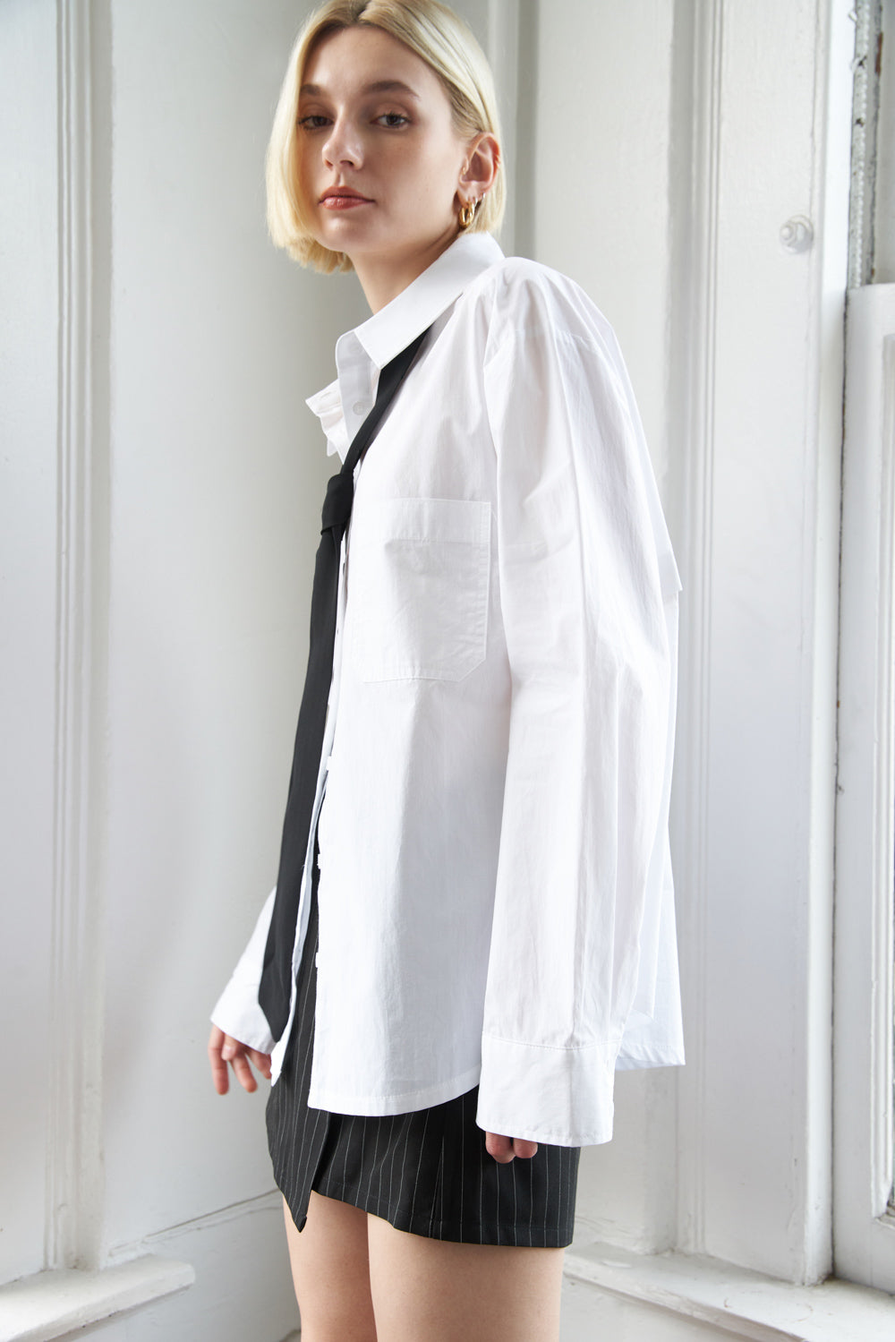 A solid woven oversized shirt with neck tie and back functional button detail