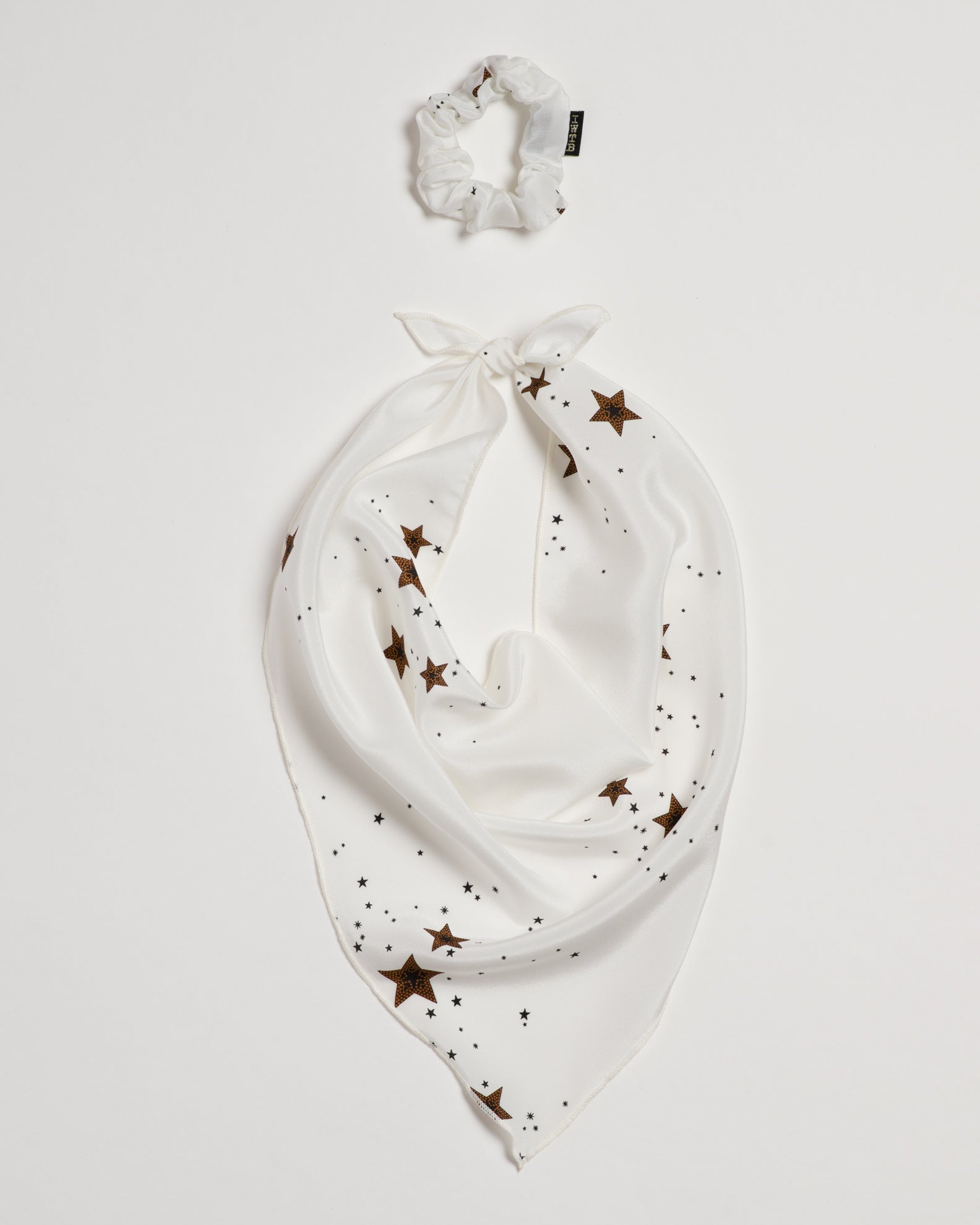 Super versatile, super fun! This style delivers in so many ways! It's not sewn together so you get a mini scrunchie and a scarf that can be worn bandana style, hair scarf style, as a handbag tie, the possibilities are endless! And of course, the way it will be prepared for you tied up in our long scrunchie tie style!