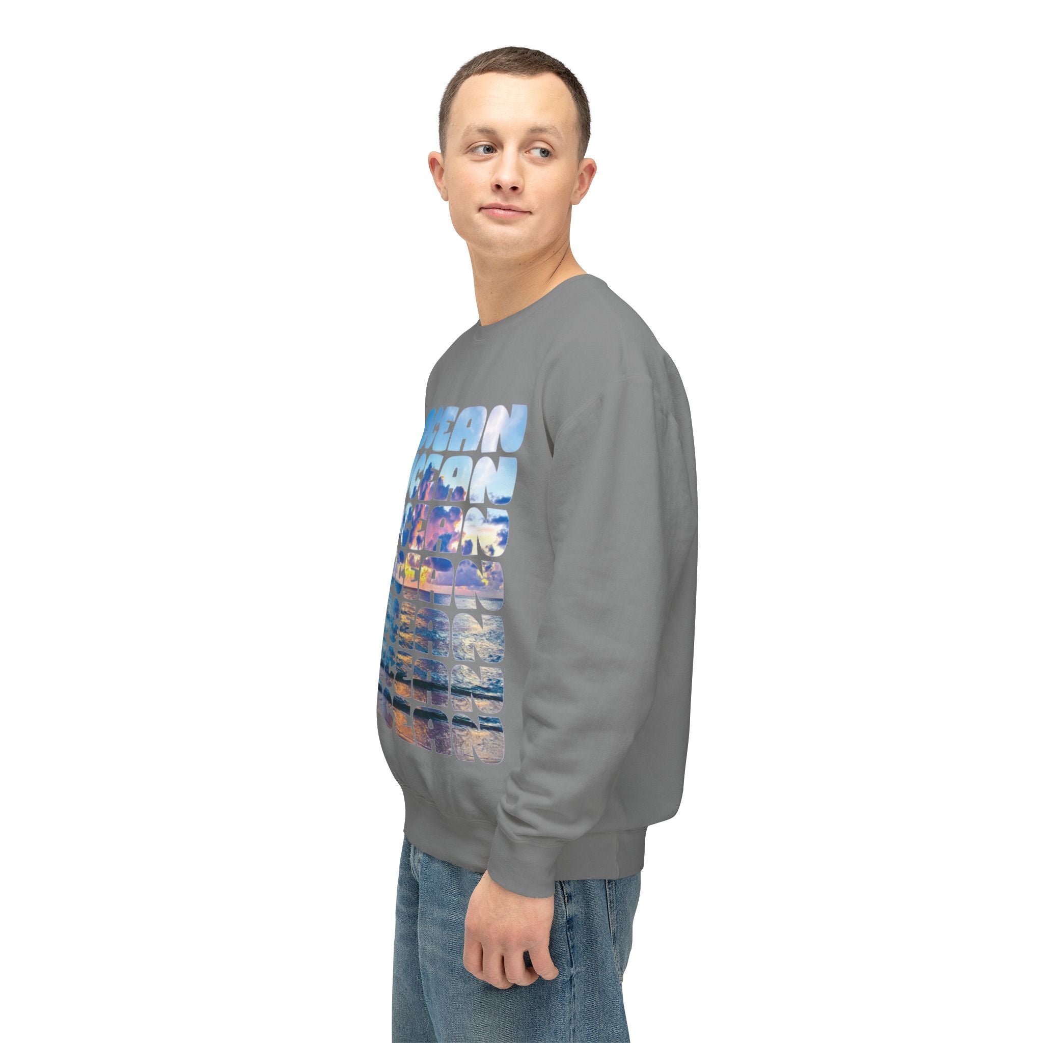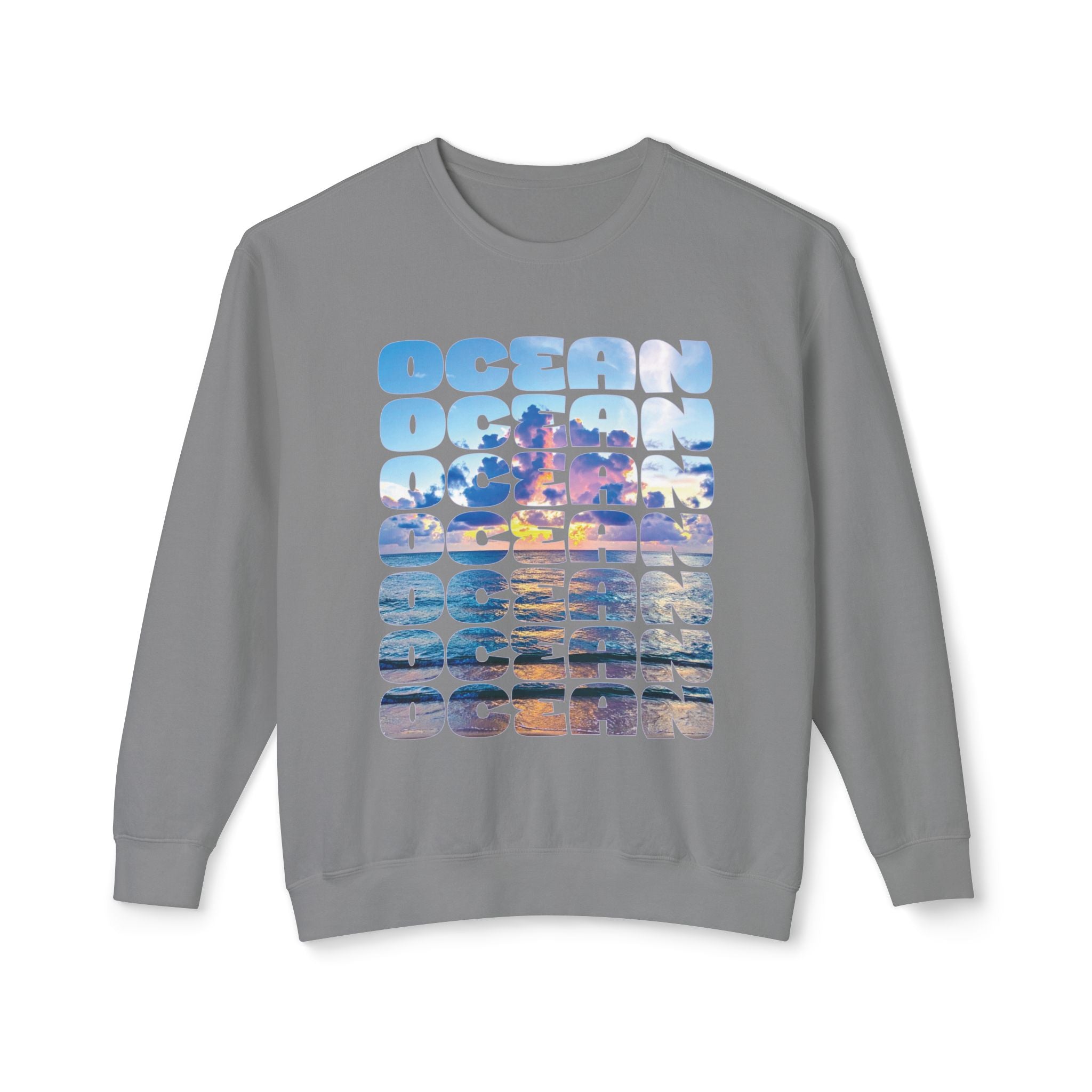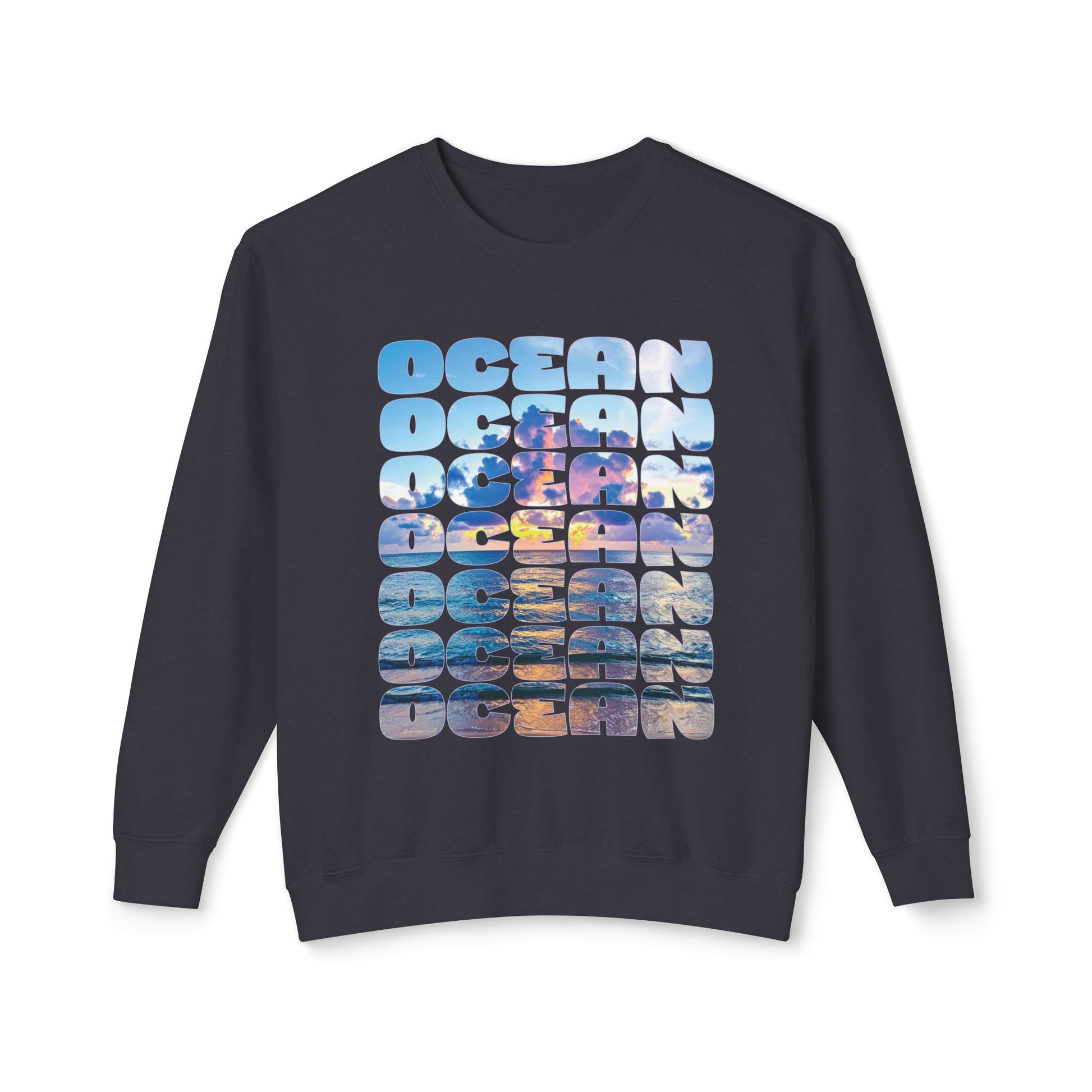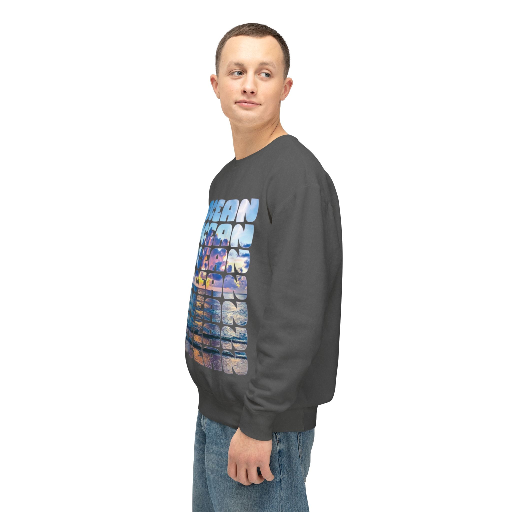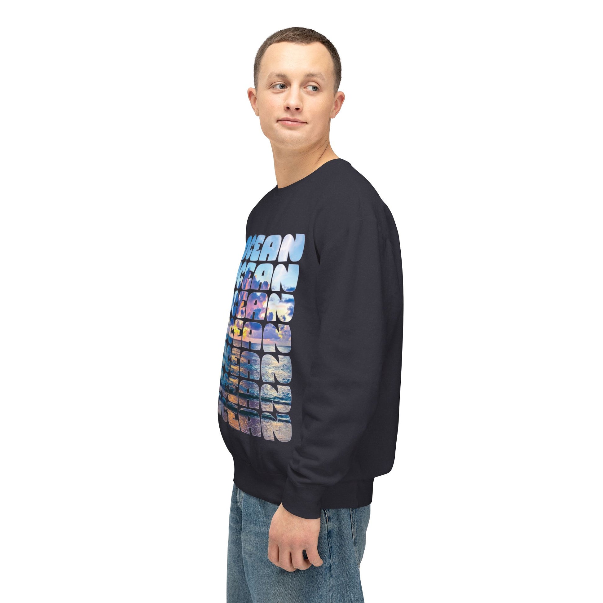 Ocean Photo Block Crewneck Sweatshirt — Scenic "OCEAN" Typography | unisex