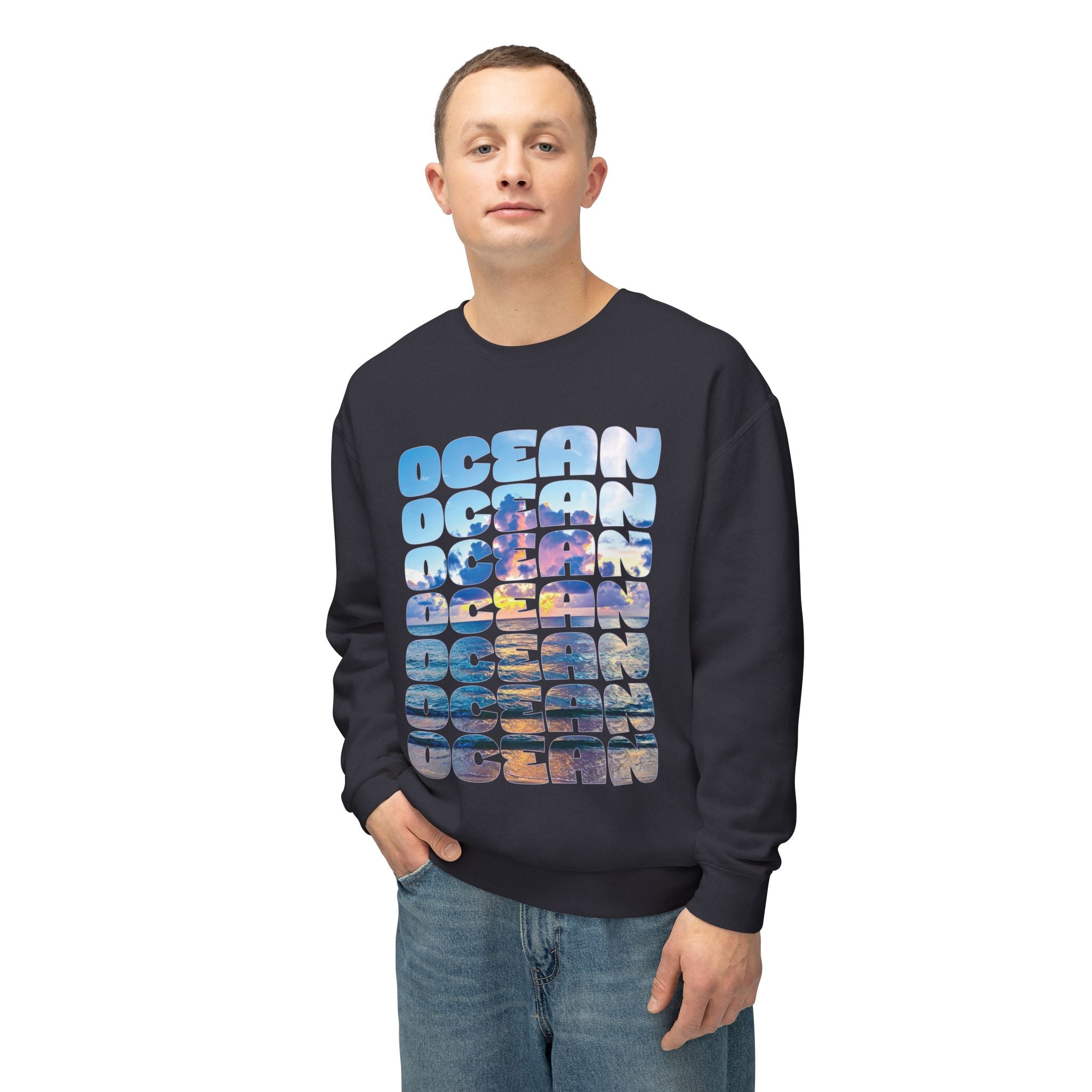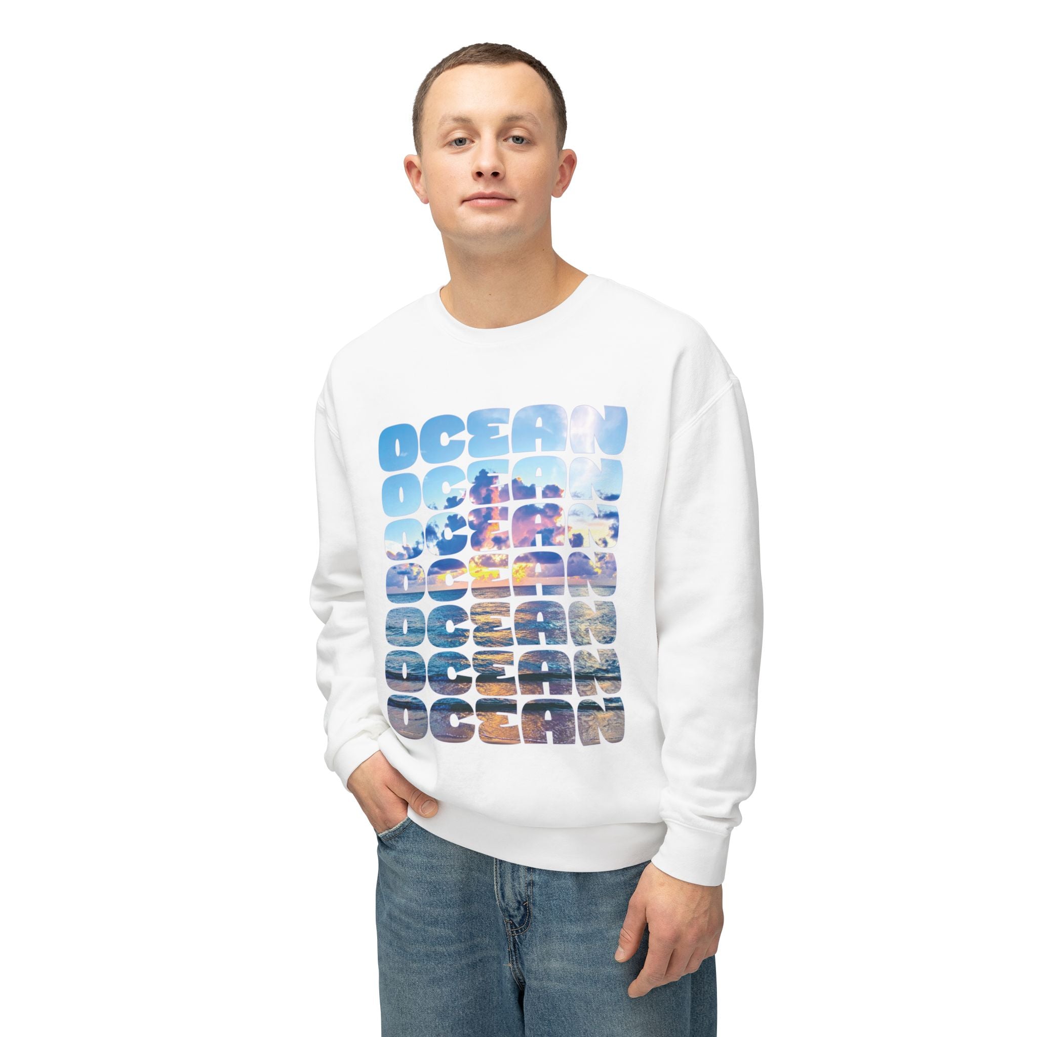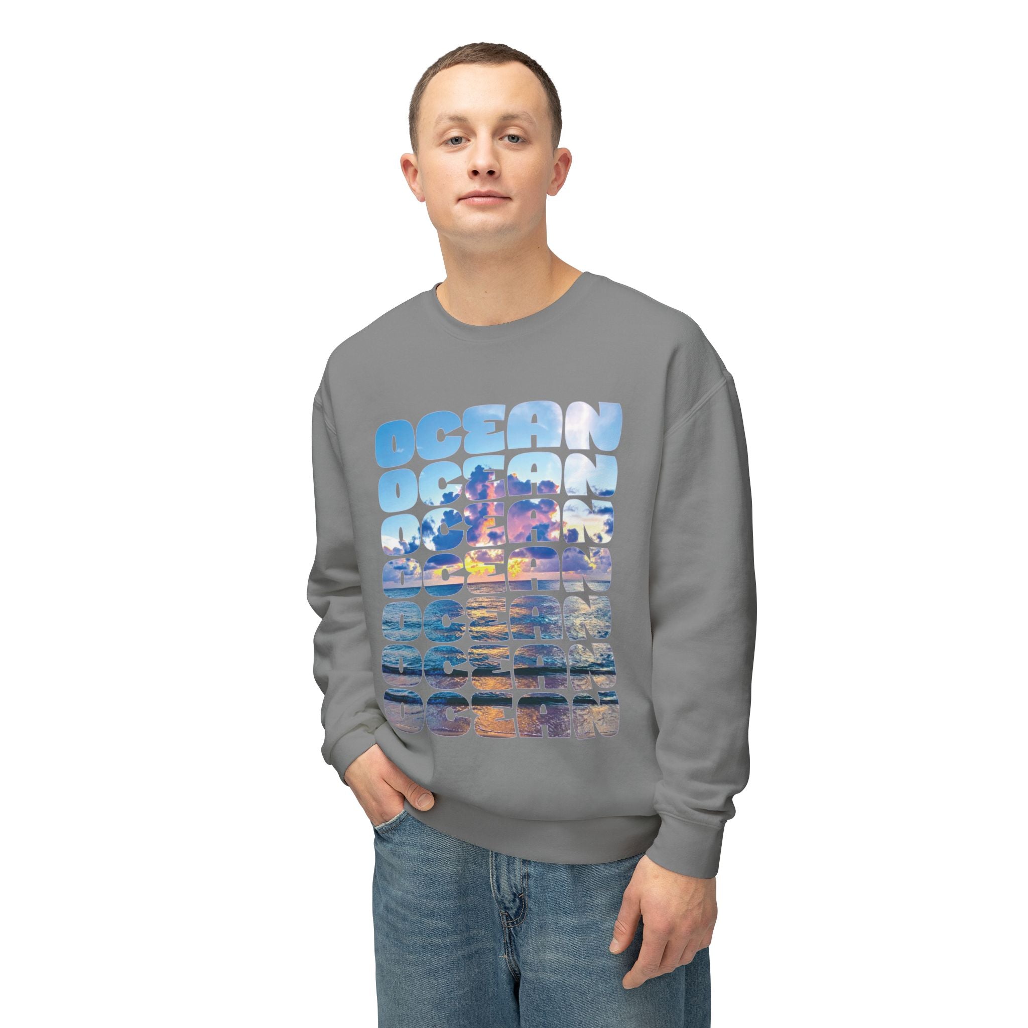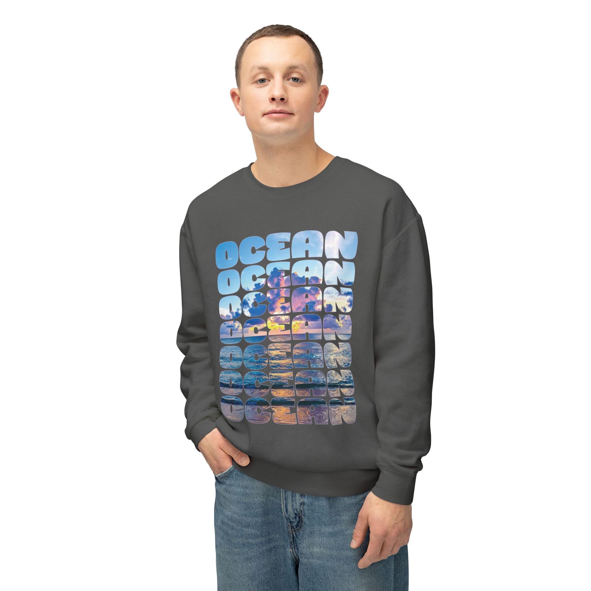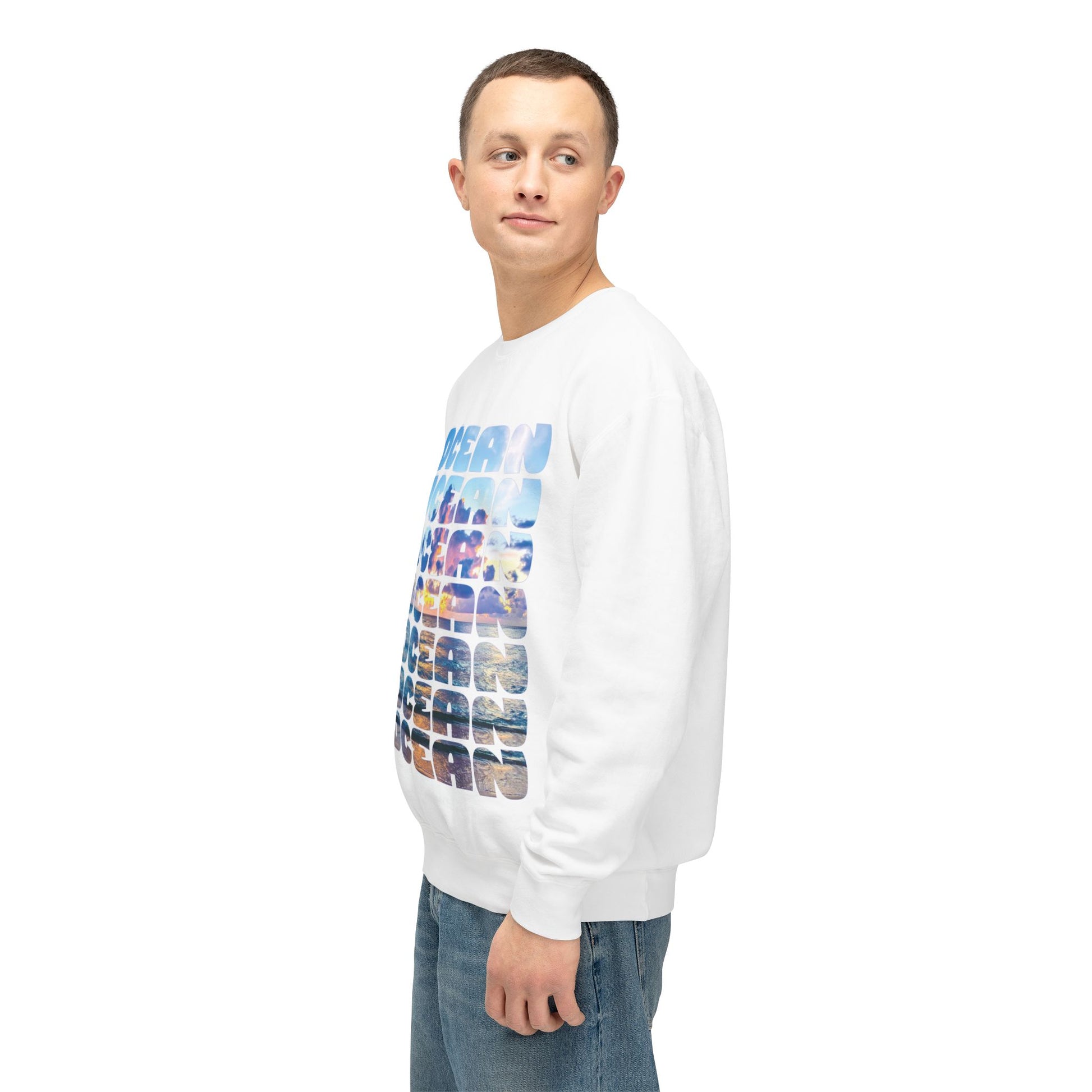 Ocean Photo Block Crewneck Sweatshirt — Scenic "OCEAN" Typography | unisex