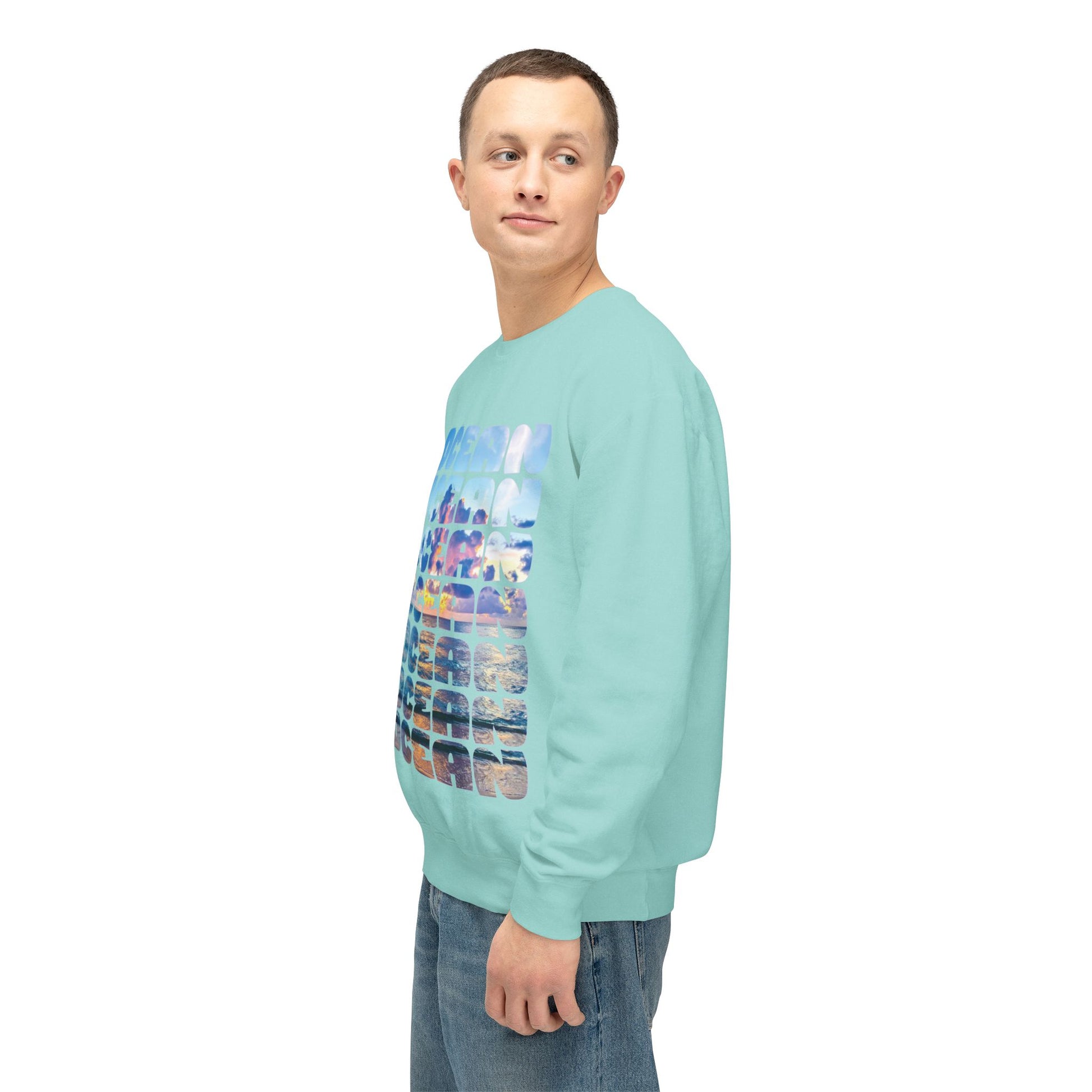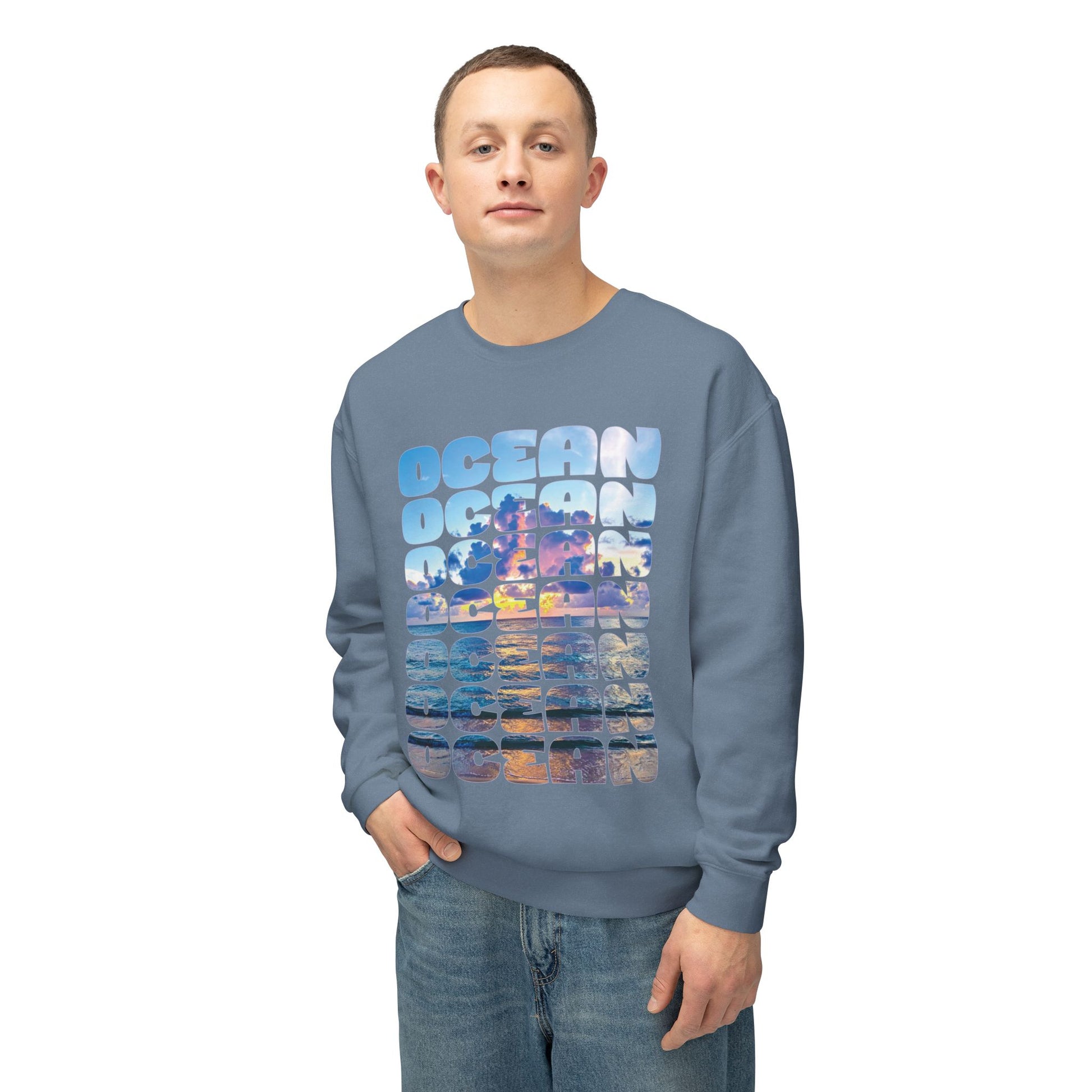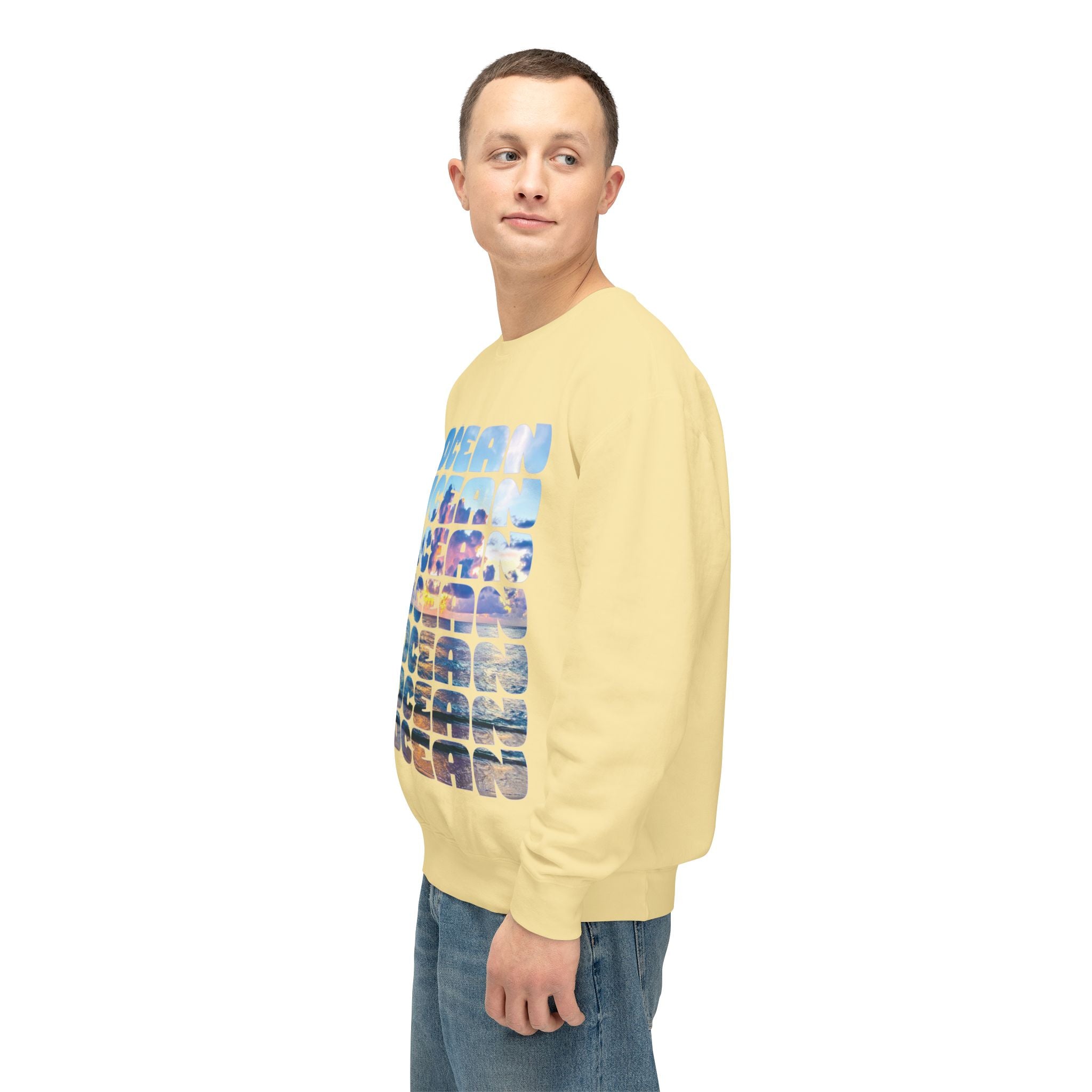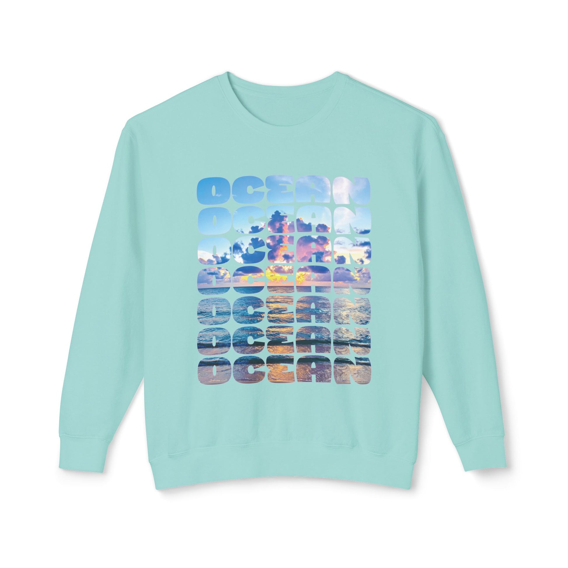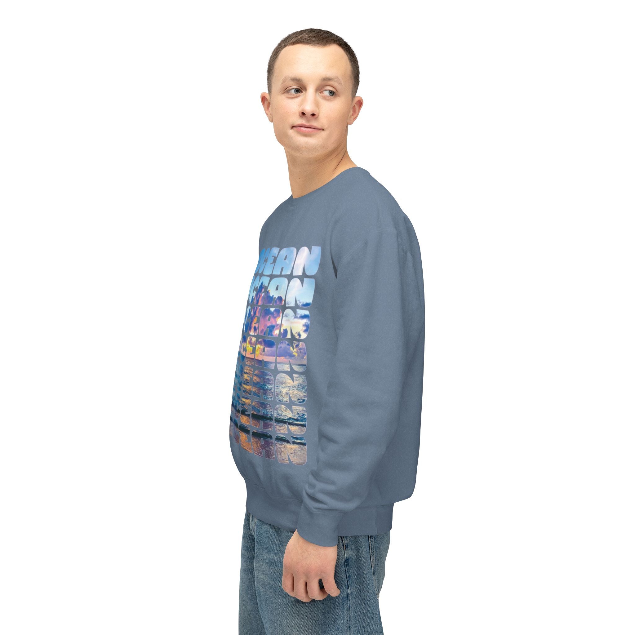 Ocean Photo Block Crewneck Sweatshirt — Scenic "OCEAN" Typography | unisex