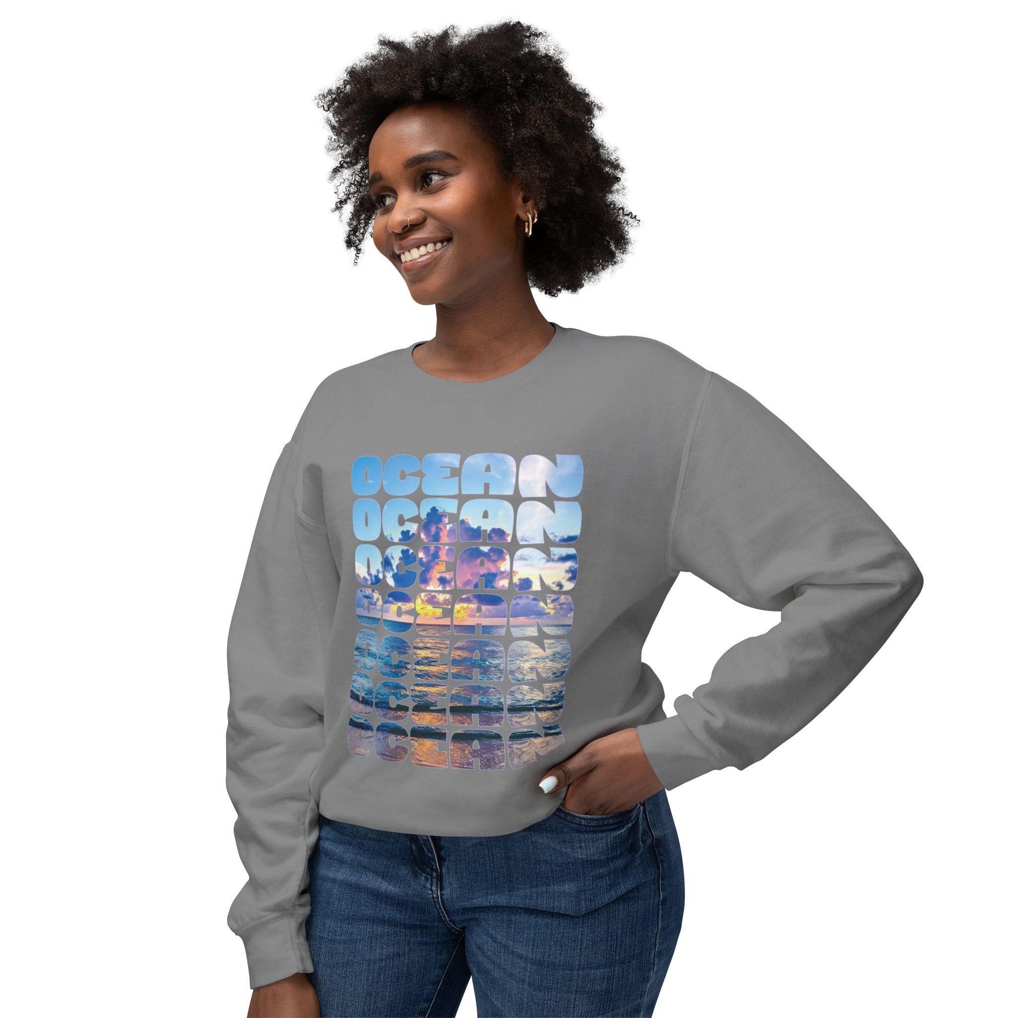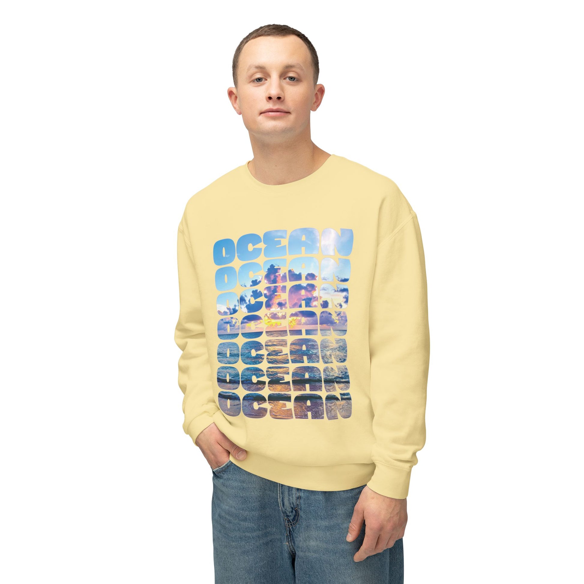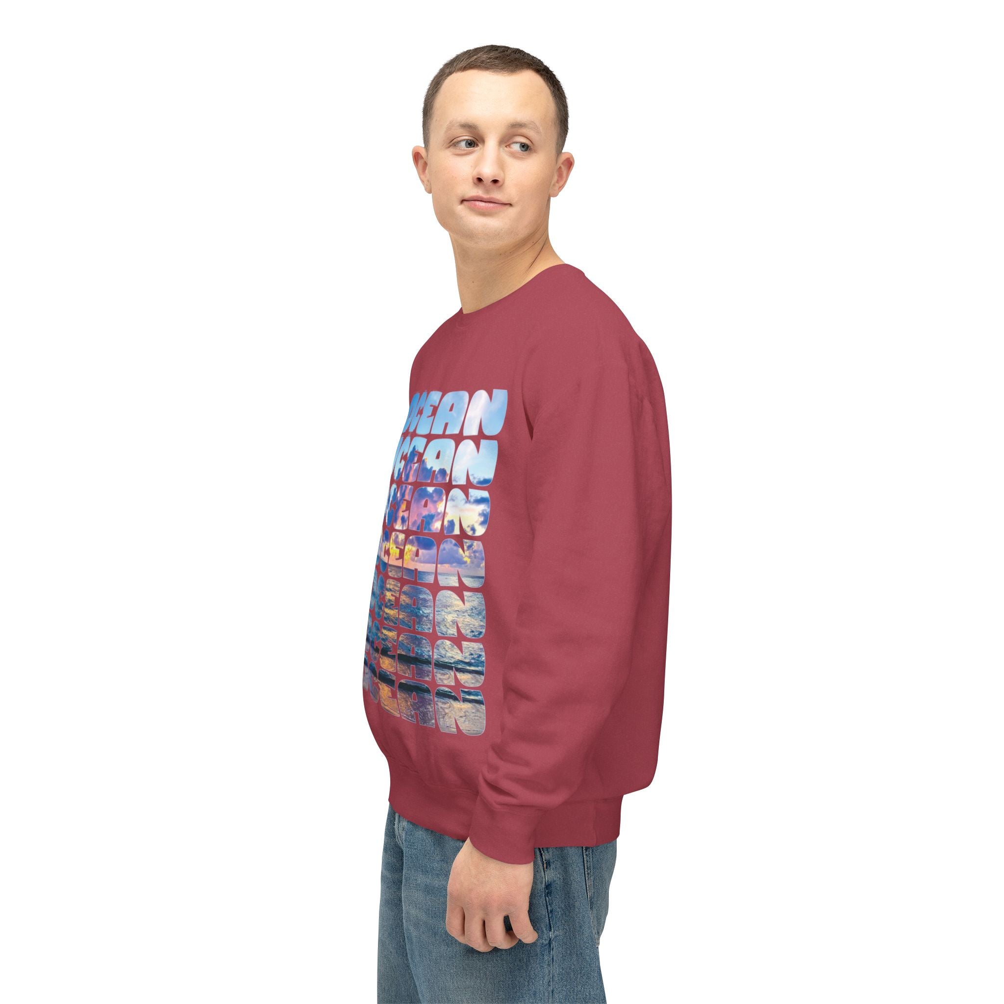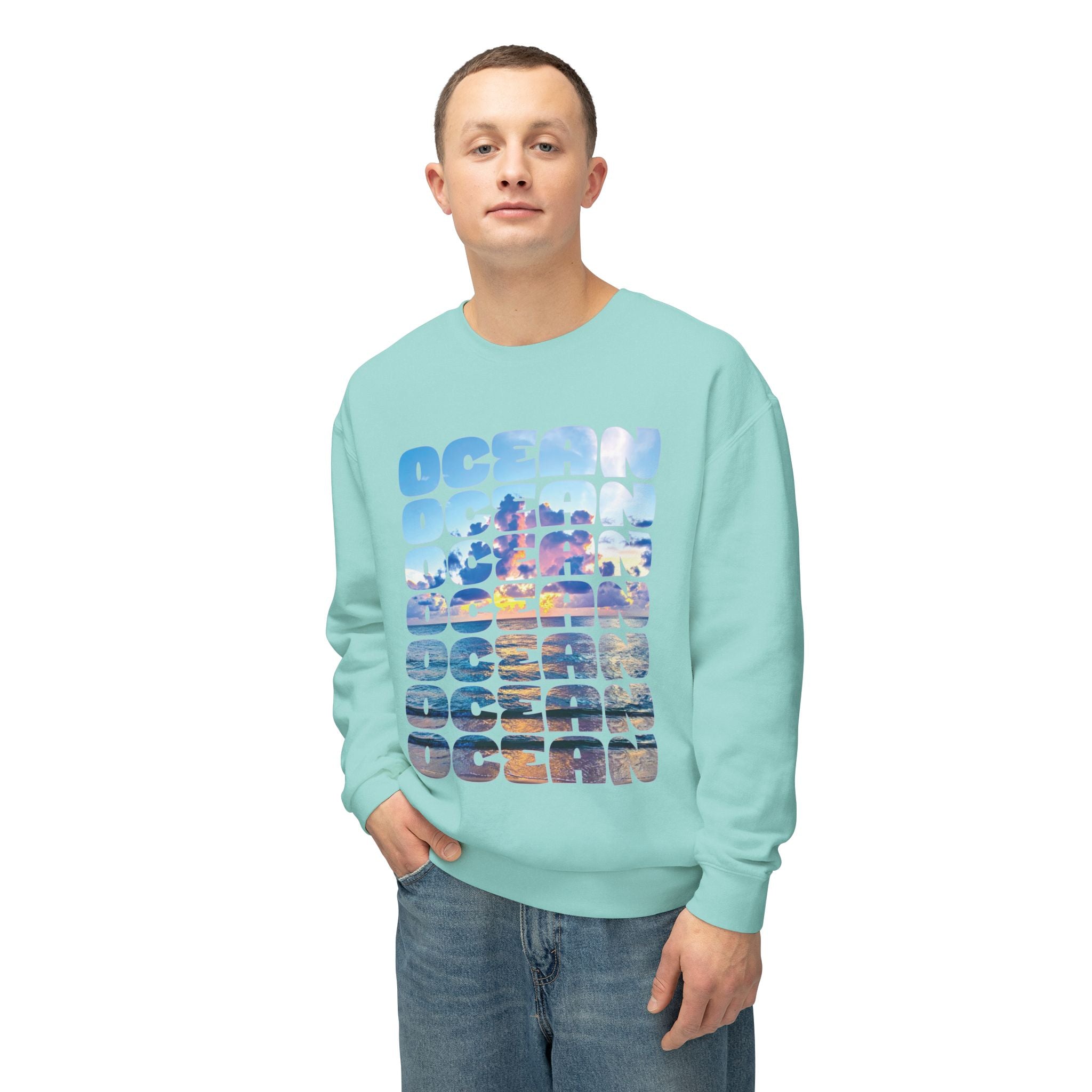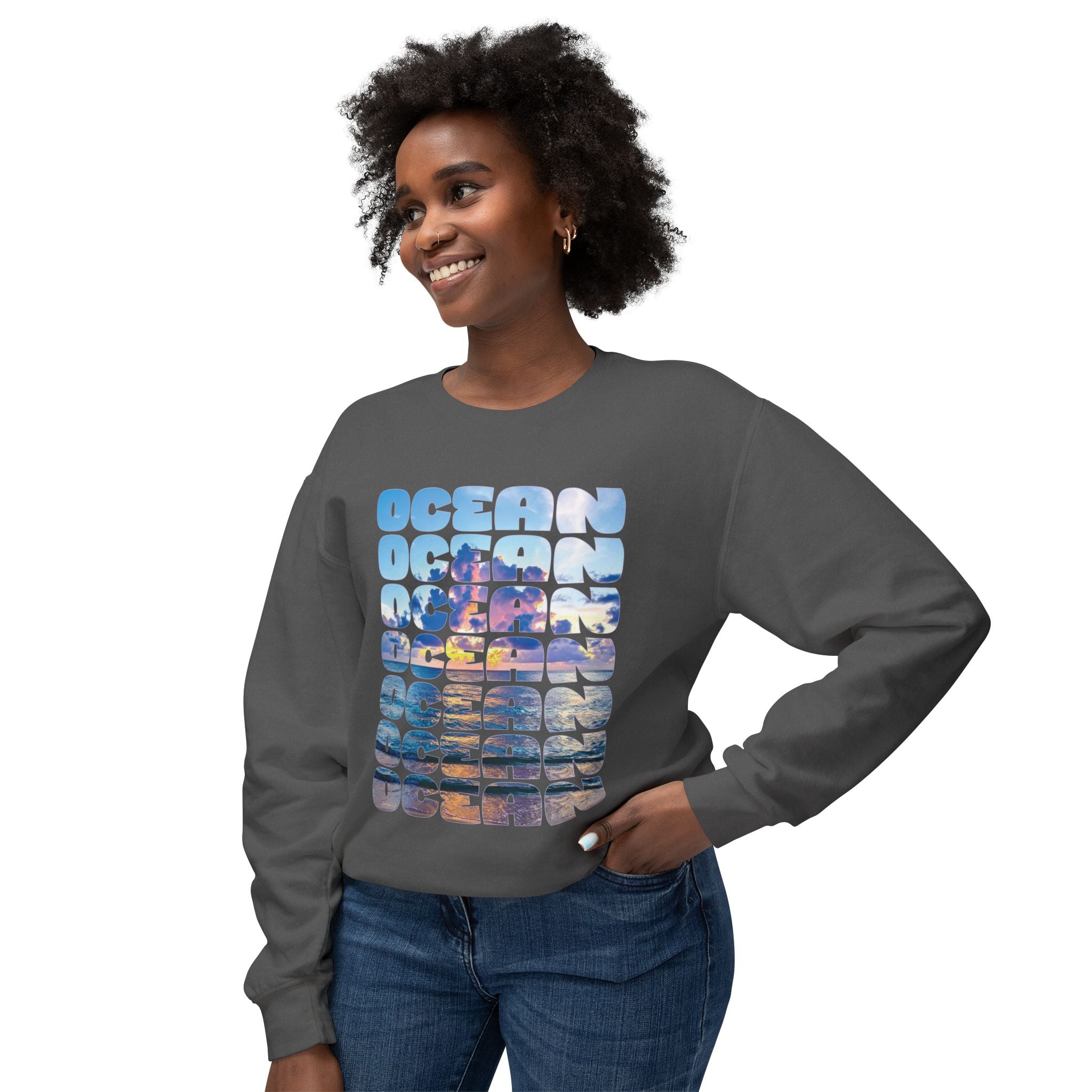 Ocean Photo Block Crewneck Sweatshirt — Scenic "OCEAN" Typography | unisex