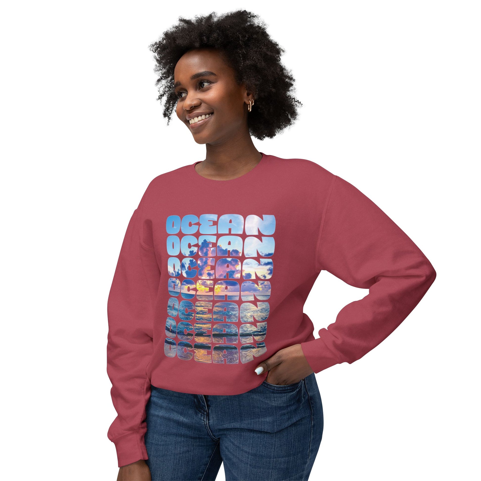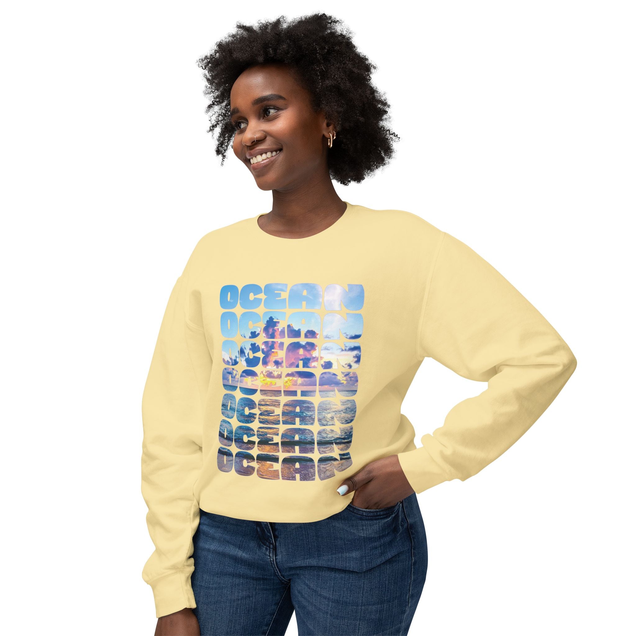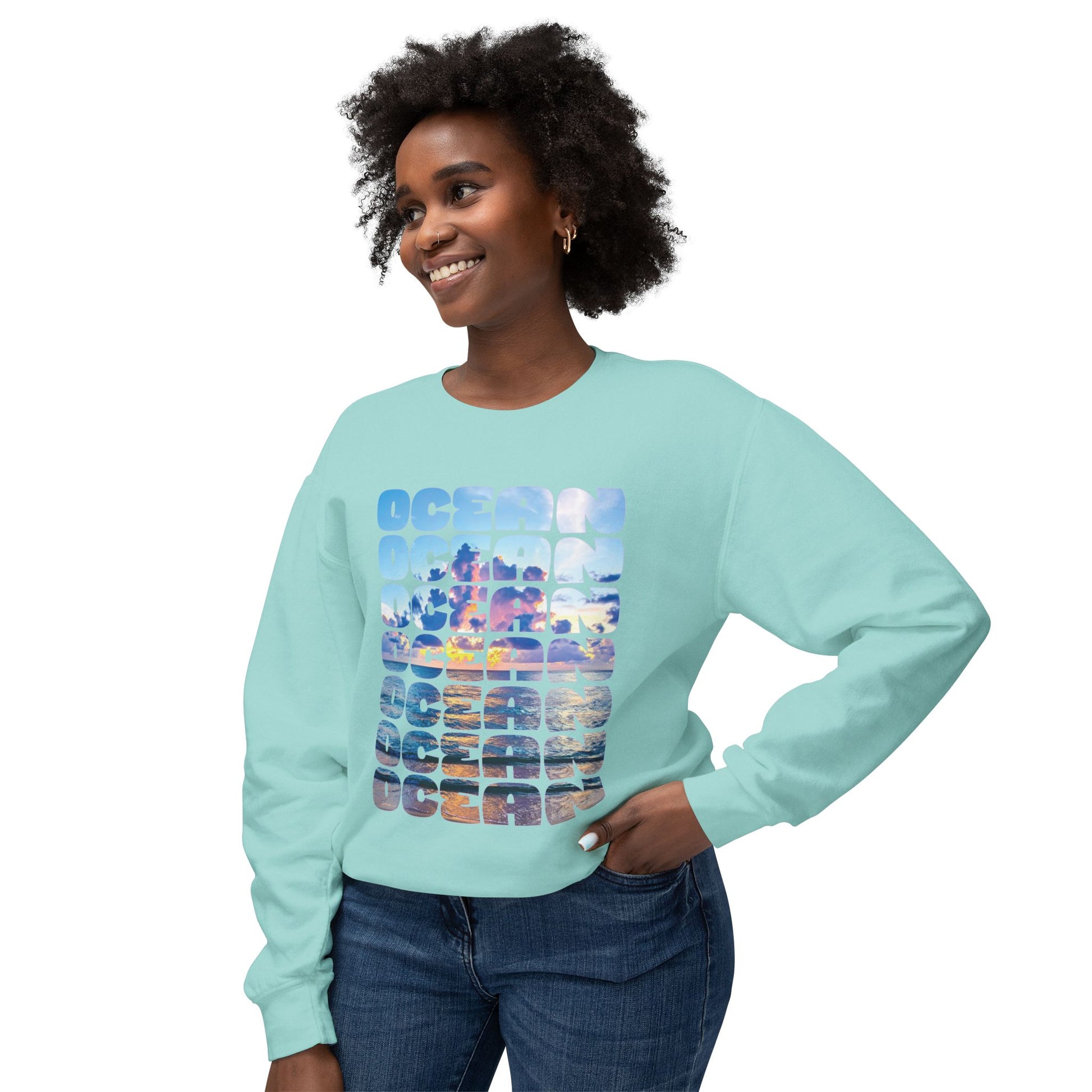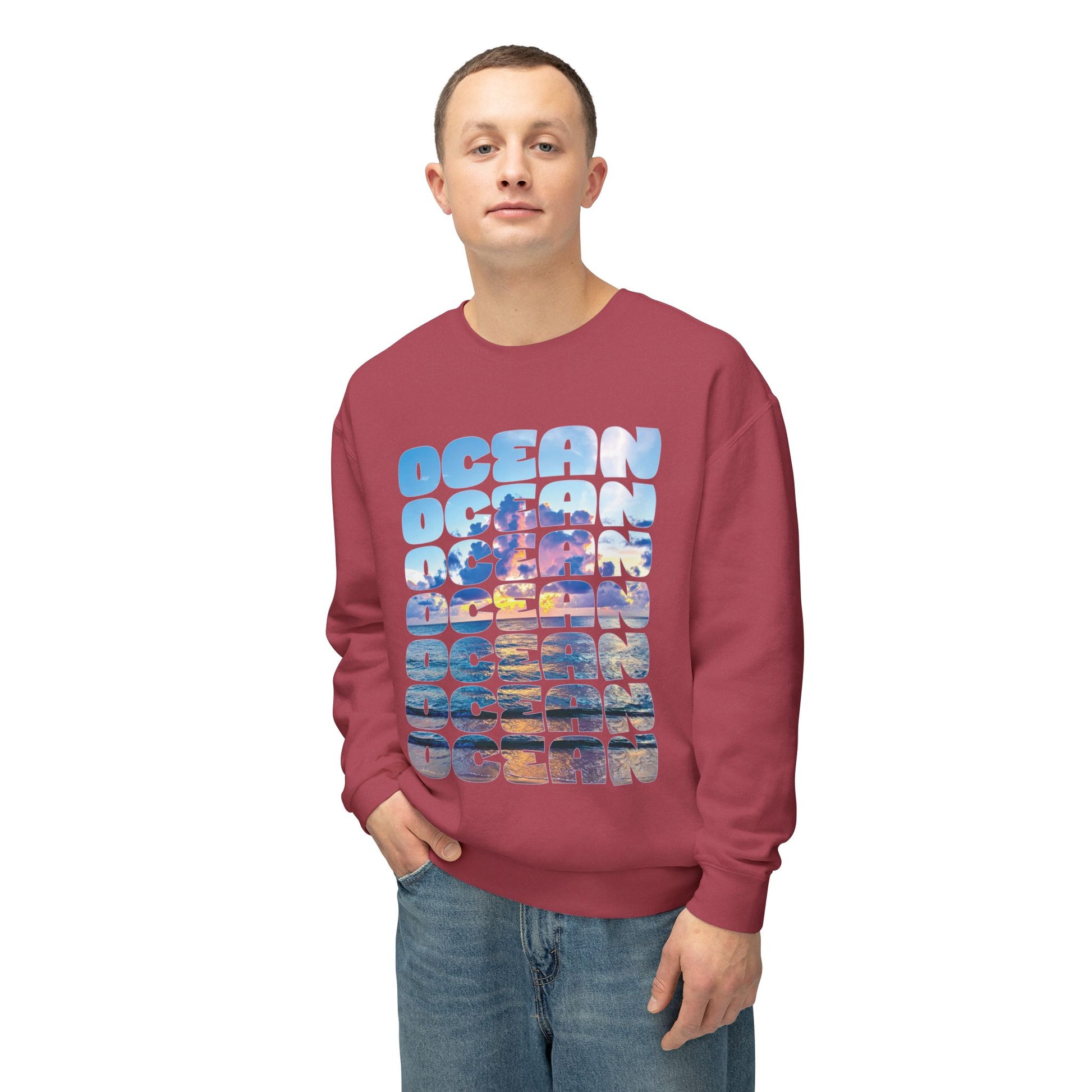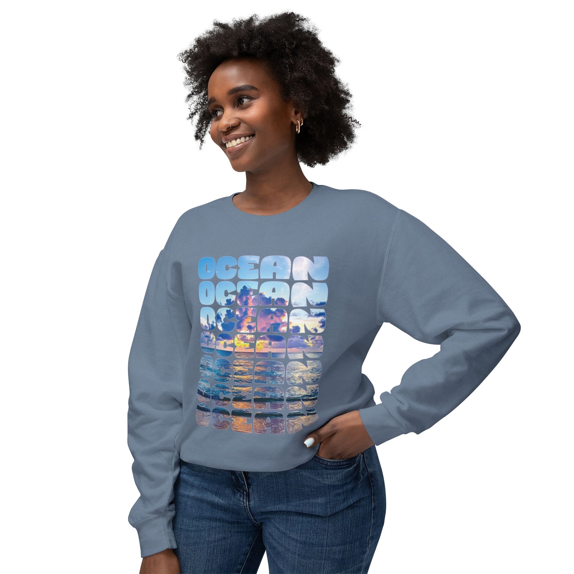 Ocean Photo Block Crewneck Sweatshirt — Scenic "OCEAN" Typography | unisex