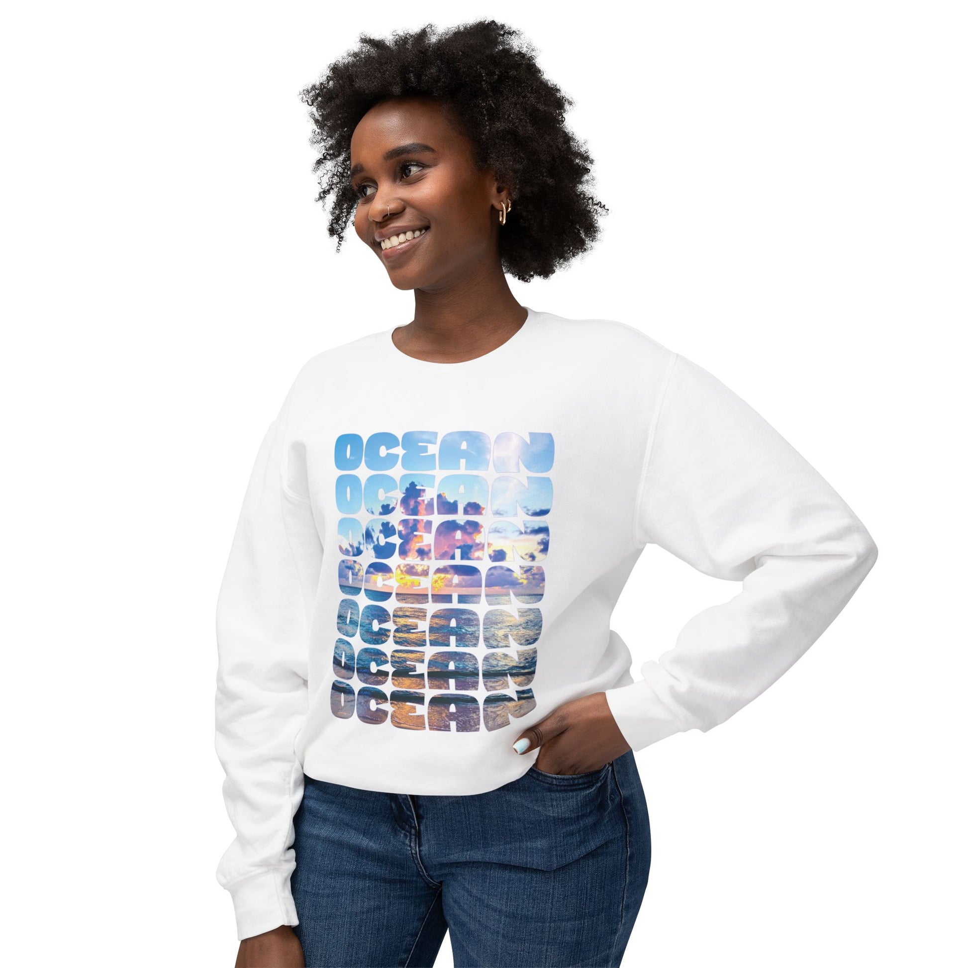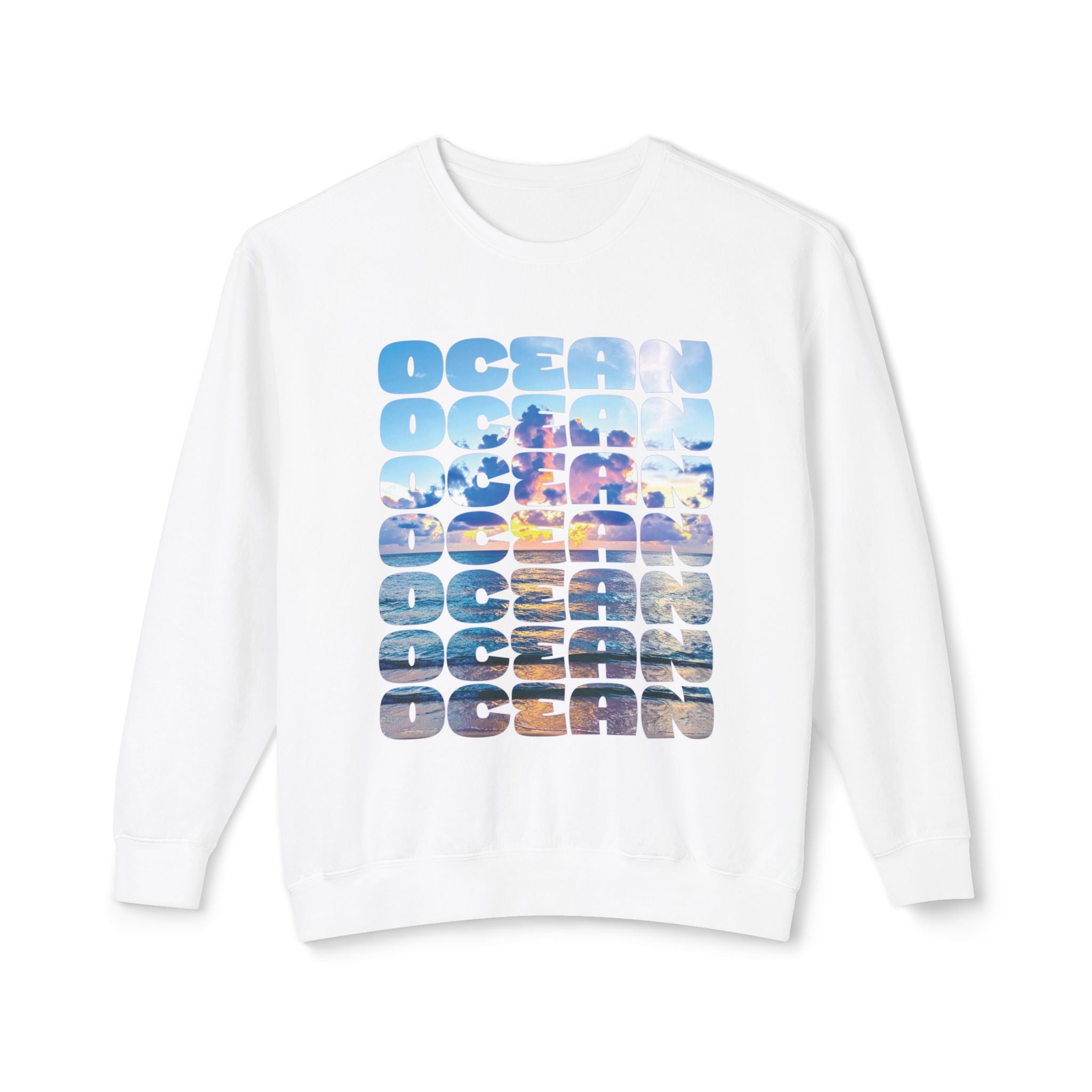 This lightweight crewneck sweatshirt carries the calm and color of the coast into everyday wear. Block letters stacked with photographic ocean scenes catch light and movement—sunrise hues, surf blues, and a distant horizon—against a clean white ground. The relaxed fit and soft ring-spun cotton make it easy to layer over a tee for morning walks, pack into a beach tote for sunset watching, or lounge in after a chilly swim. It reads like a small window to the shore: familiar, quiet, and slowly warming as the day unfolds.