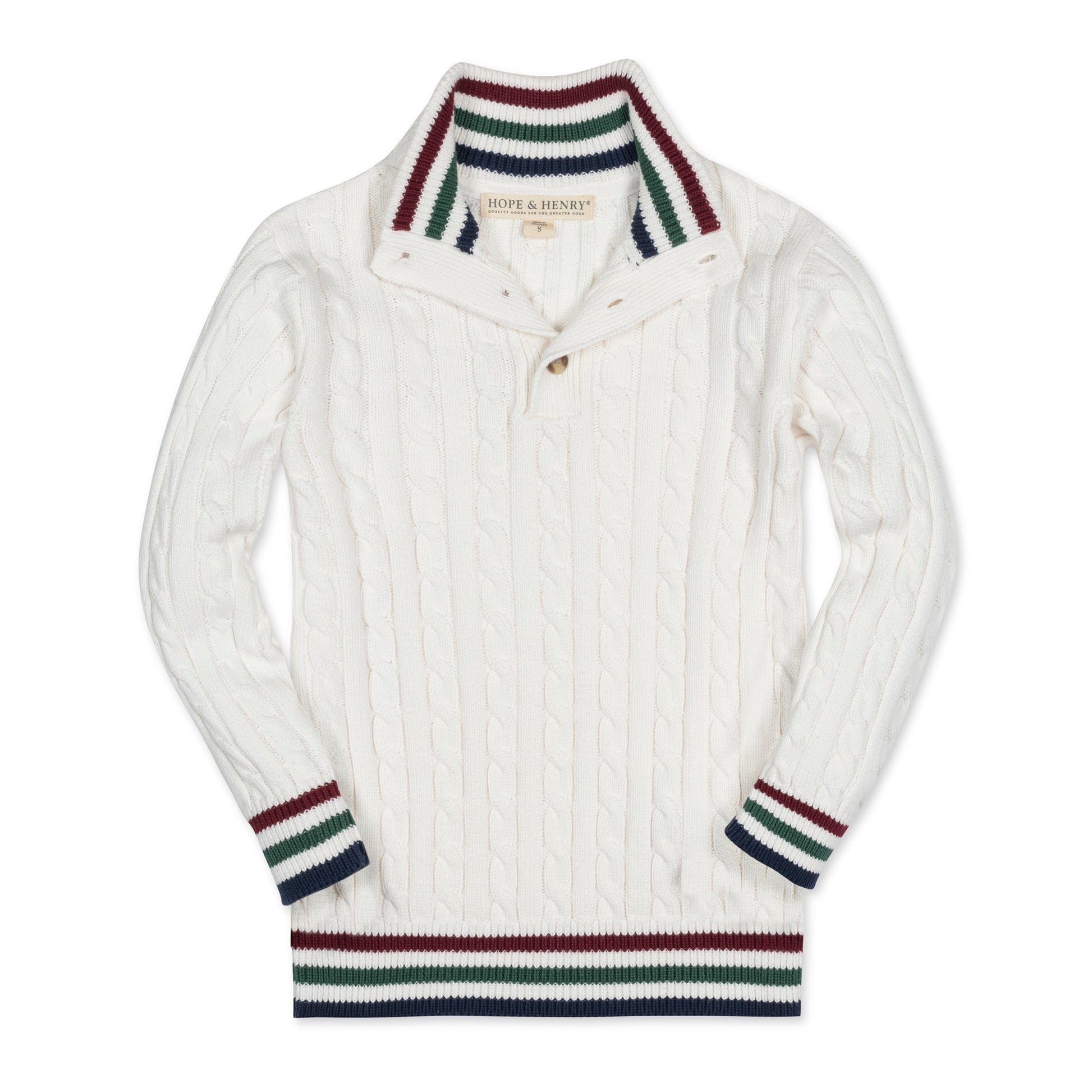 Classic cables in our signature organic cotton yarns make this sweater a must have for cooler months. Features a rib knit mock neck, faux horn button closures at the center front placket, and stripe trim at the cuff, hem, and inner collar. Pairs perfectly with our collection of organic cotton button downs and pants.