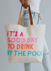 Make every pool day feel like a getaway with our Poolside Bliss Tote—the ultimate carryall for sunny adventures! Crafted from 100% cotton, this spacious cream-colored tote features a vibrant multicolored design with the playful phrase "It's a Good Day to Drink by the Pool"—because, let’s be honest, every poolside moment deserves a little extra fun.