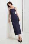 A dark denim midi dress featuring straight neckline, straps, body contouring and back zipper closure with slit