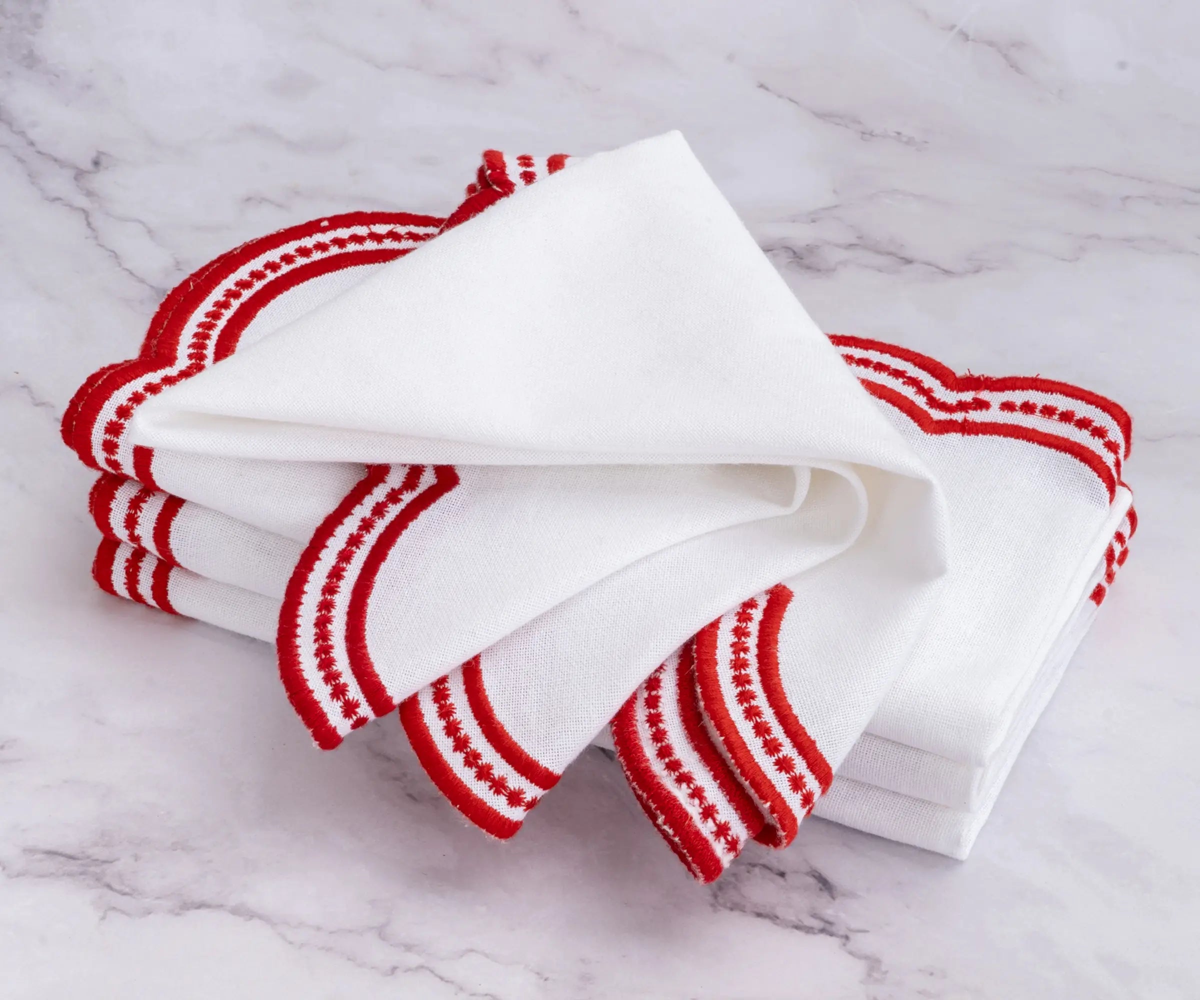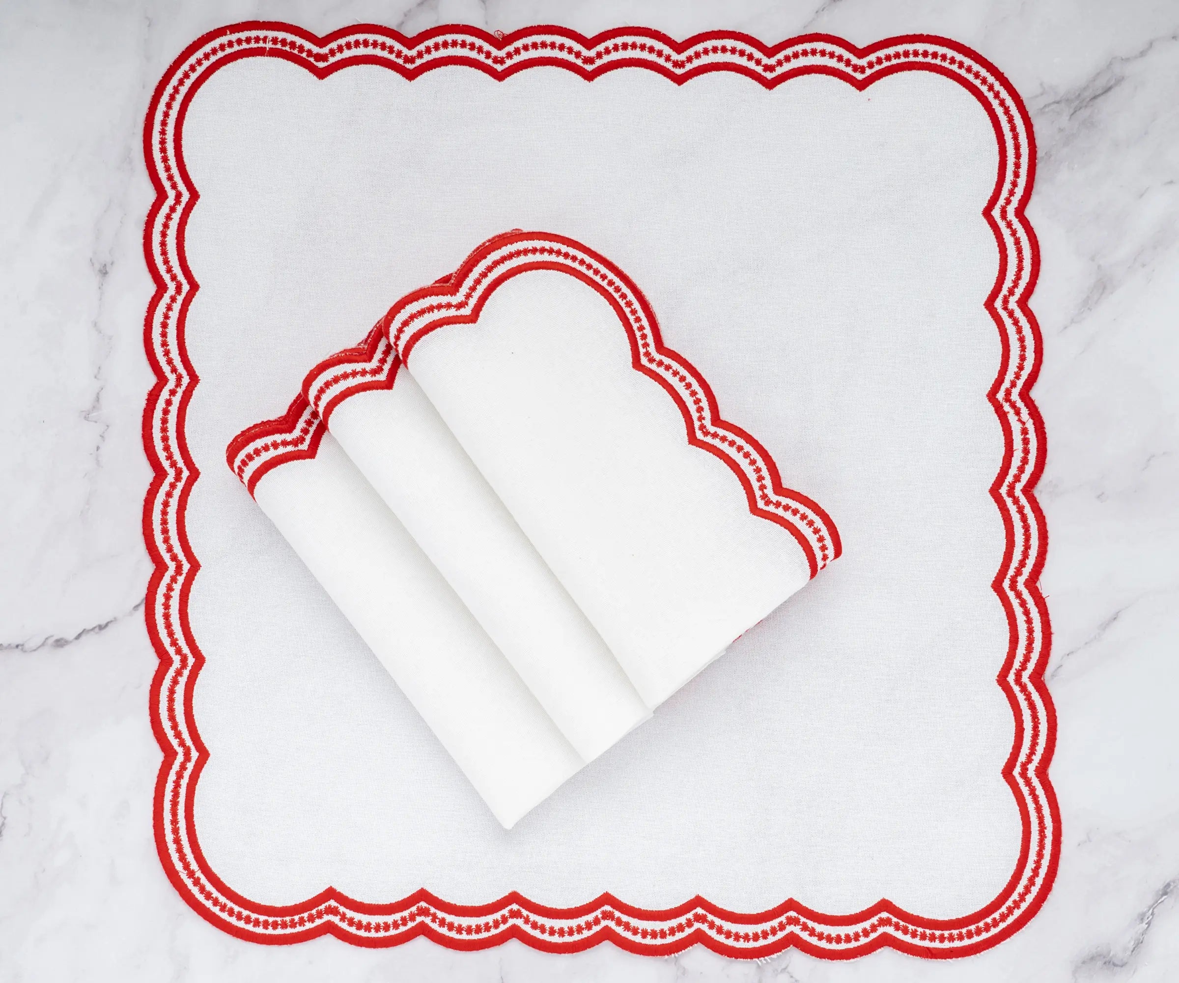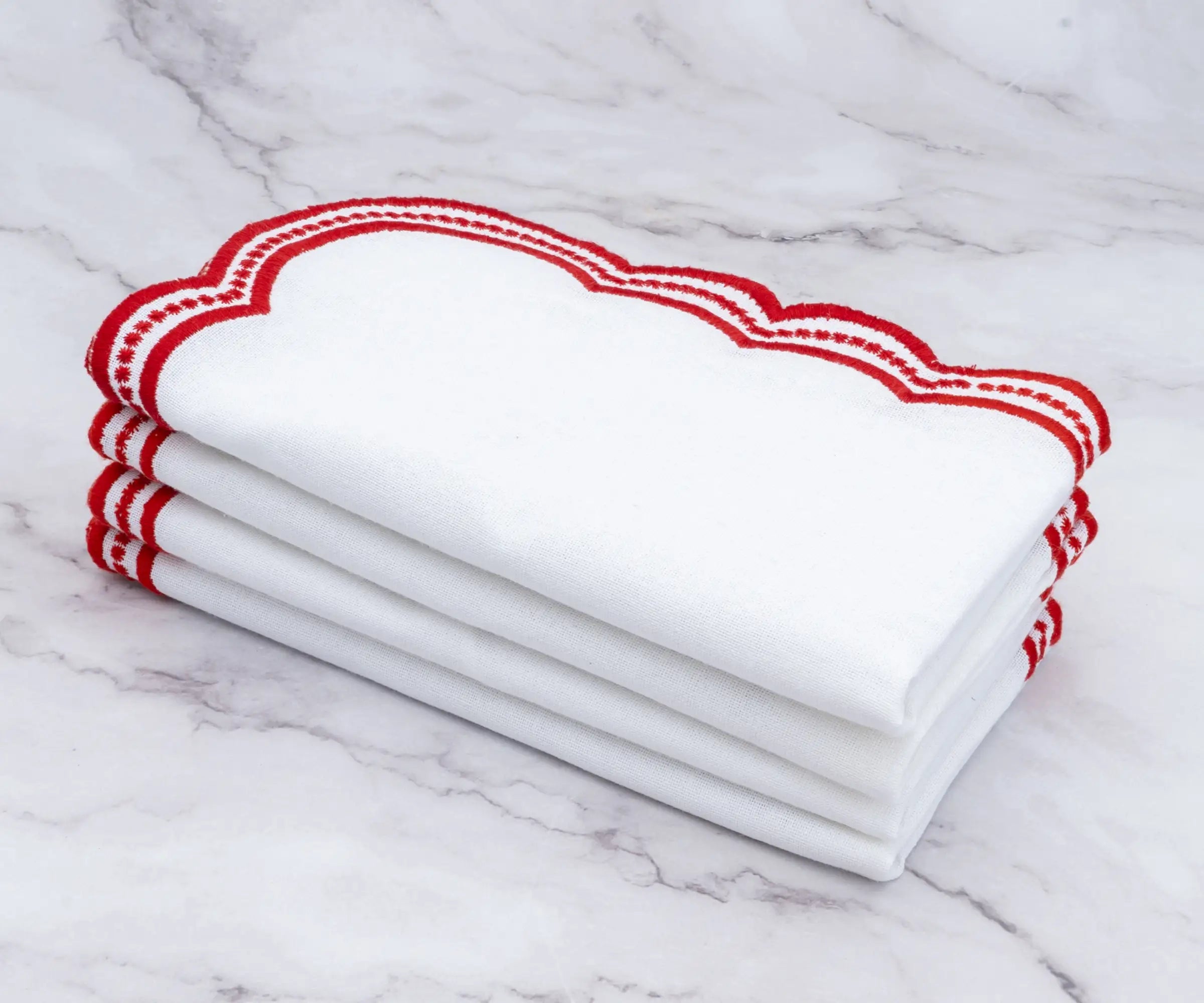 Elevate your table with our Red scalloped embroidered napkins, a perfect blend of elegance and charm. These cotton dinner napkins feature delicate scalloped embroidery, adding sophistication to any setting. Ideal for special occasions or everyday luxury, these scalloped napkins bring timeless beauty to your dining experience.