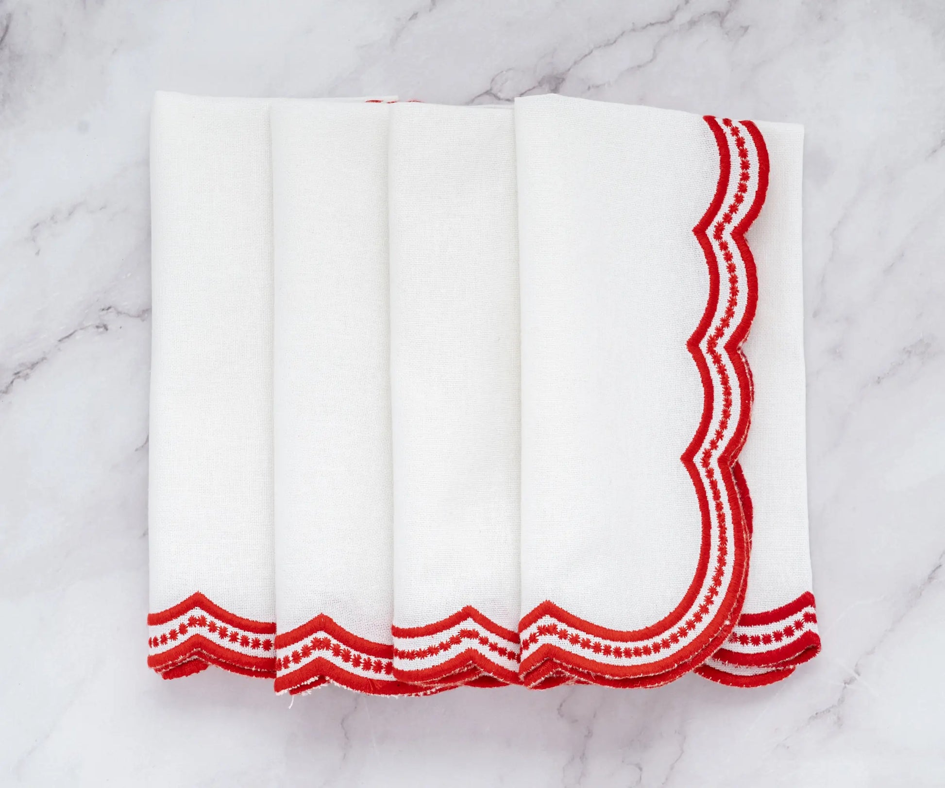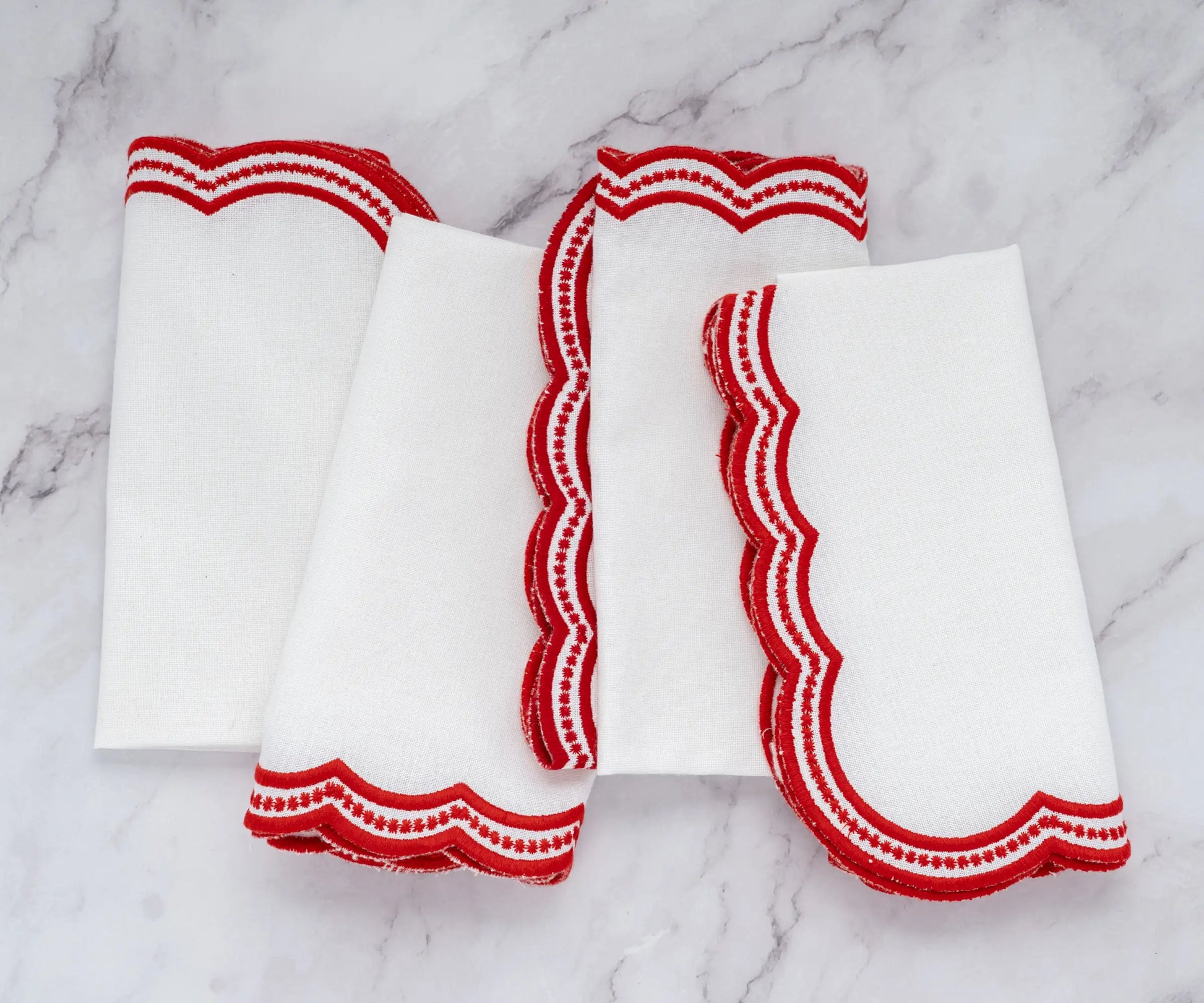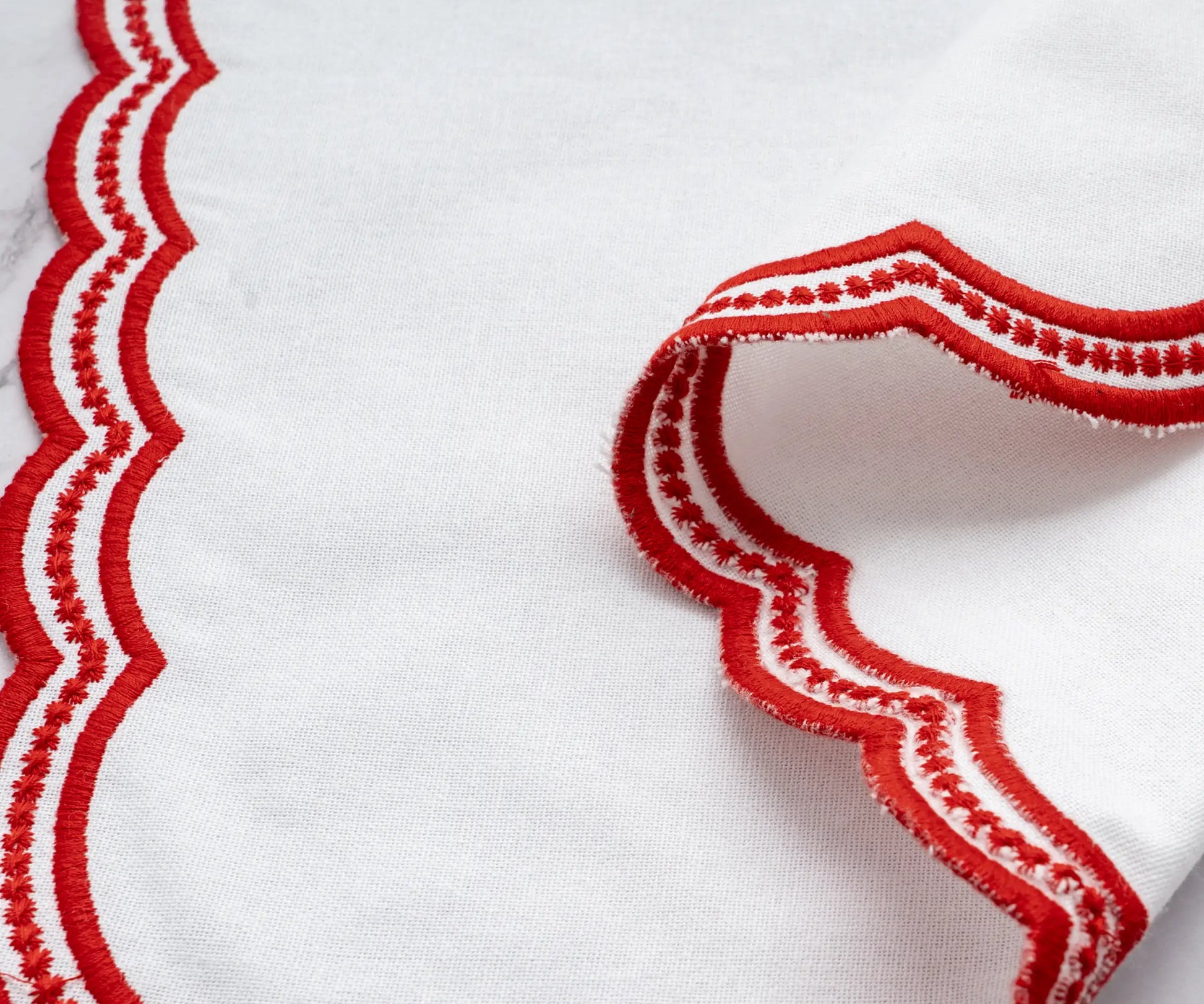 Elevate your table with our Red scalloped embroidered napkins, a perfect blend of elegance and charm. These cotton dinner napkins feature delicate scalloped embroidery, adding sophistication to any setting. Ideal for special occasions or everyday luxury, these scalloped napkins bring timeless beauty to your dining experience.
