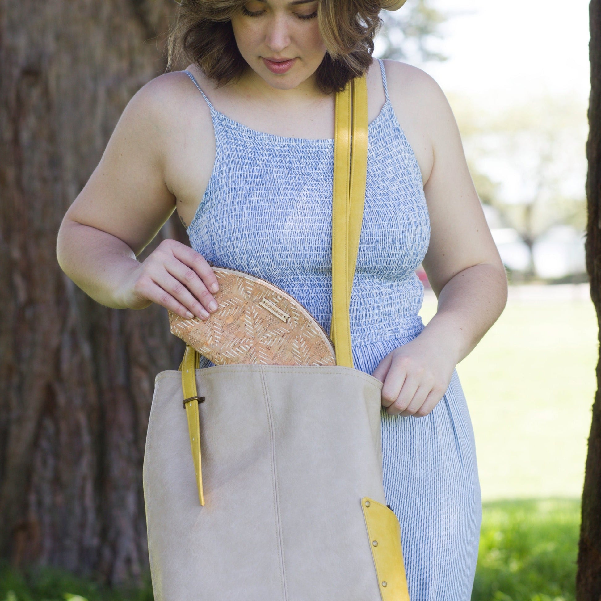 You'll love filling this curvy top bag with all your favorite goodies and notions. It's the perfect size for organizing makeup brushes, writing and art supplies, or any little bits that need containing. Cork fabric makes this bag a memorable RULE BREAKER, just like you!