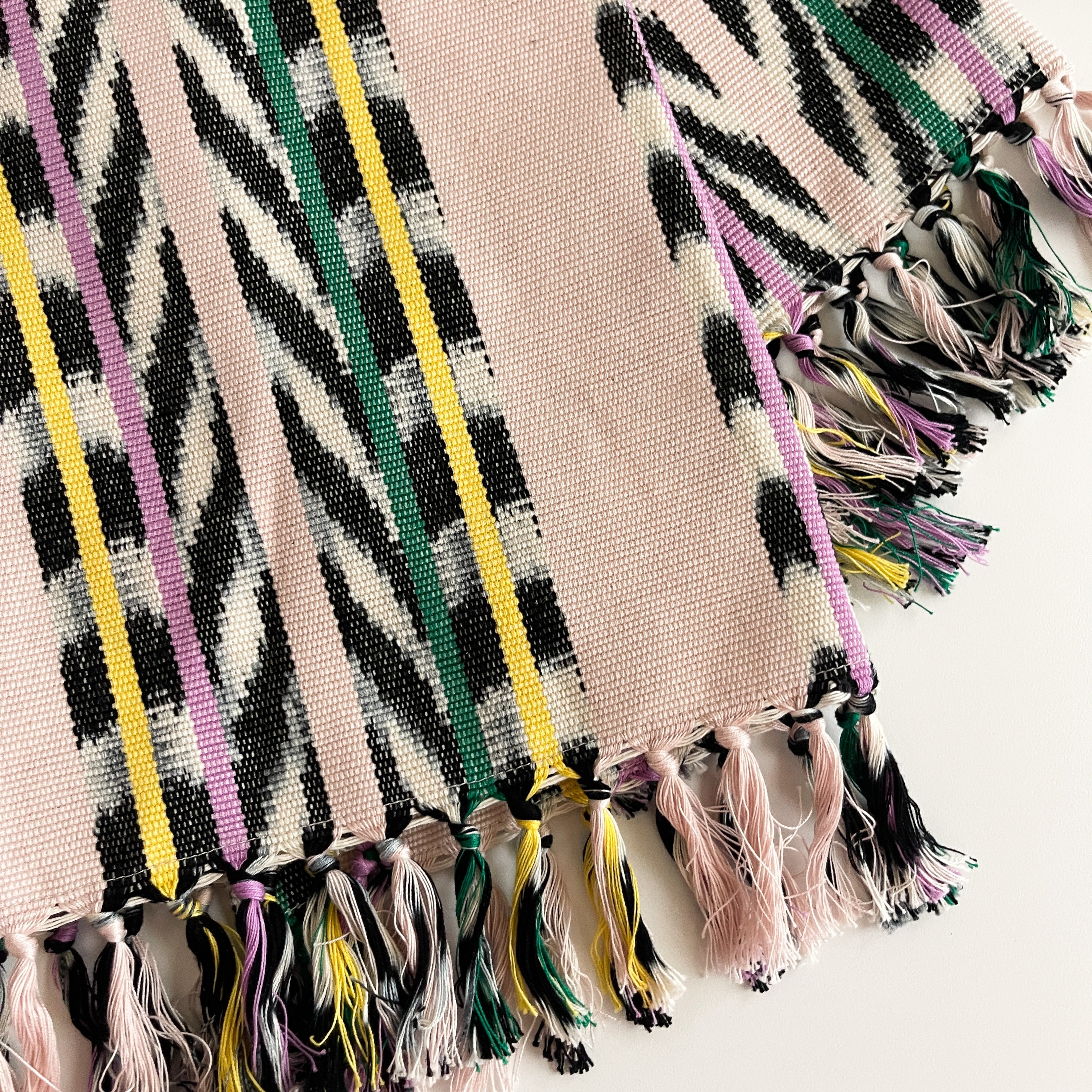 This multi color tea towel was woven in Guatemala by artisans on traditional footlooms featuring an intricate Guatemalan tie dye technique jaspe that creates the stunning colorful striped ikat pattern.