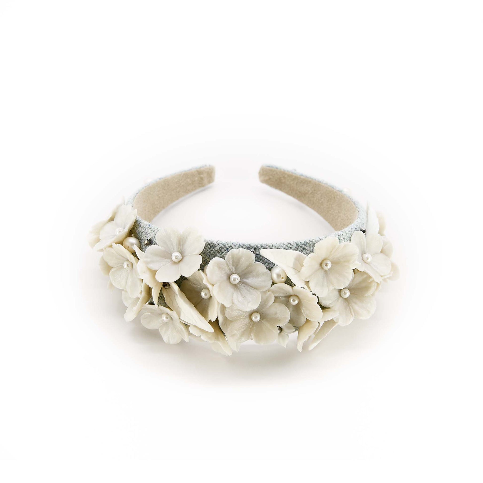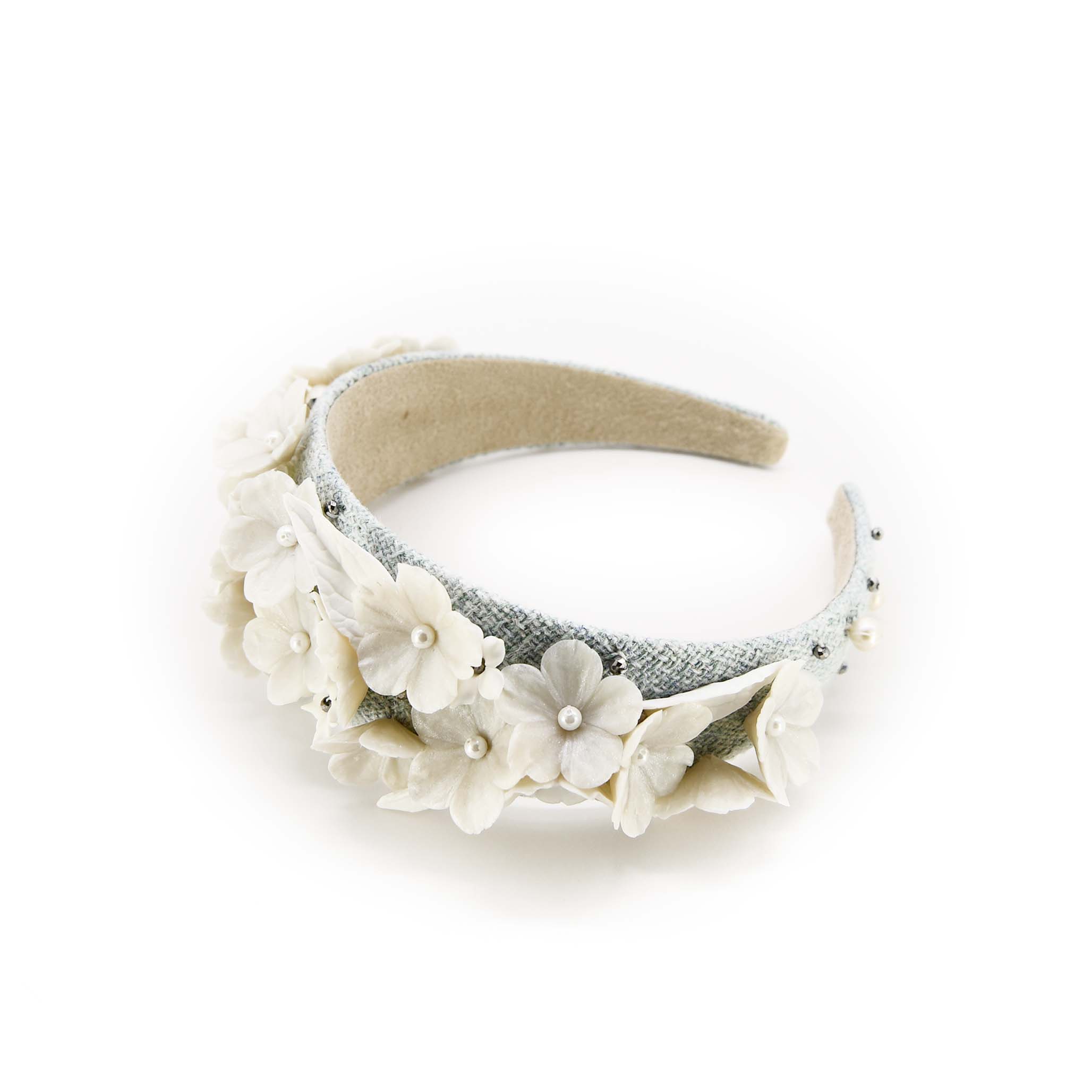 Stephanotis Pearl floral Headband named after the Stephanotis flower which represents good fortune. Stephanotis Pearl floral Headband is handmade with polymer clay flowers, leaves featuring precious fresh pearls and silver glass crystals on baby blue linen blend fabric base.