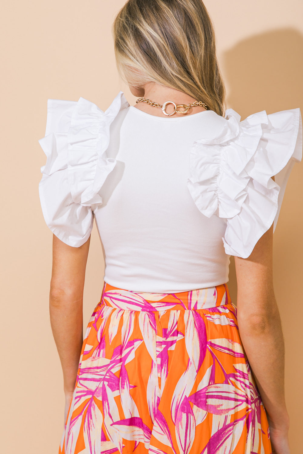 Indulge in the luxury of our versatile knit bodysuit, complete with a chic V neckline adorned with delicate ruffles and a convenient bottom snap closure.