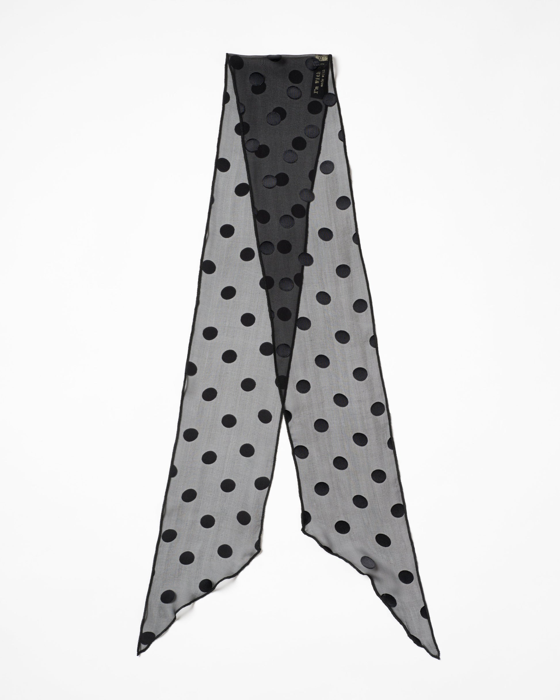 As perfect and classic as it gets in our humble opinion. Black on black, silk burnout with silk charmeuse polka dots. Lightweight so it floats with you and creates a perfect, effortless drape. Very cute styled in a pussycat bow around the neck or hair as well as the classic styling, draped around the neck. Get your hands on this limited edition piece made from designer deadstock silk in a limited supply.