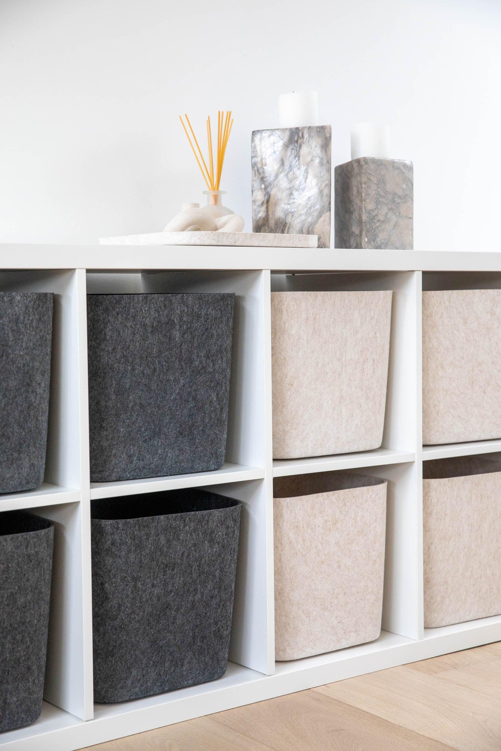 Available in Carbon and Stone, our Sculpted Bin is designed to maintain its modern shape, providing a sleek and stylish storage solution.