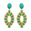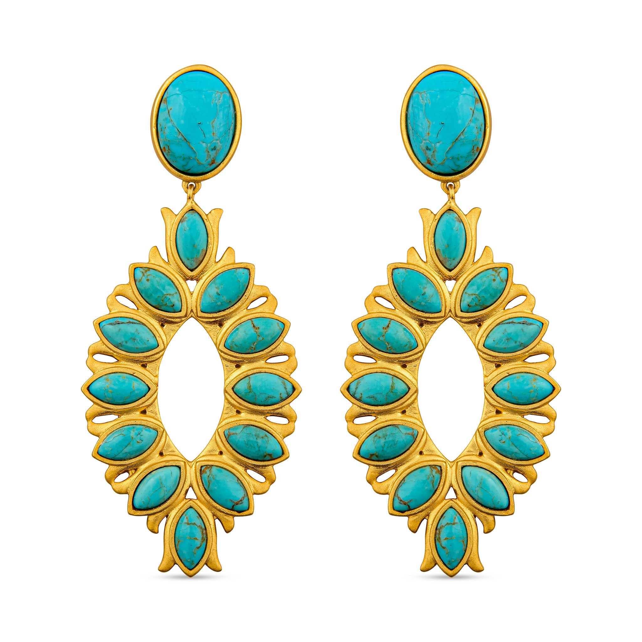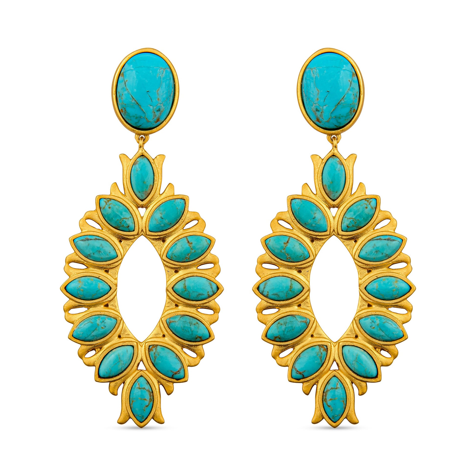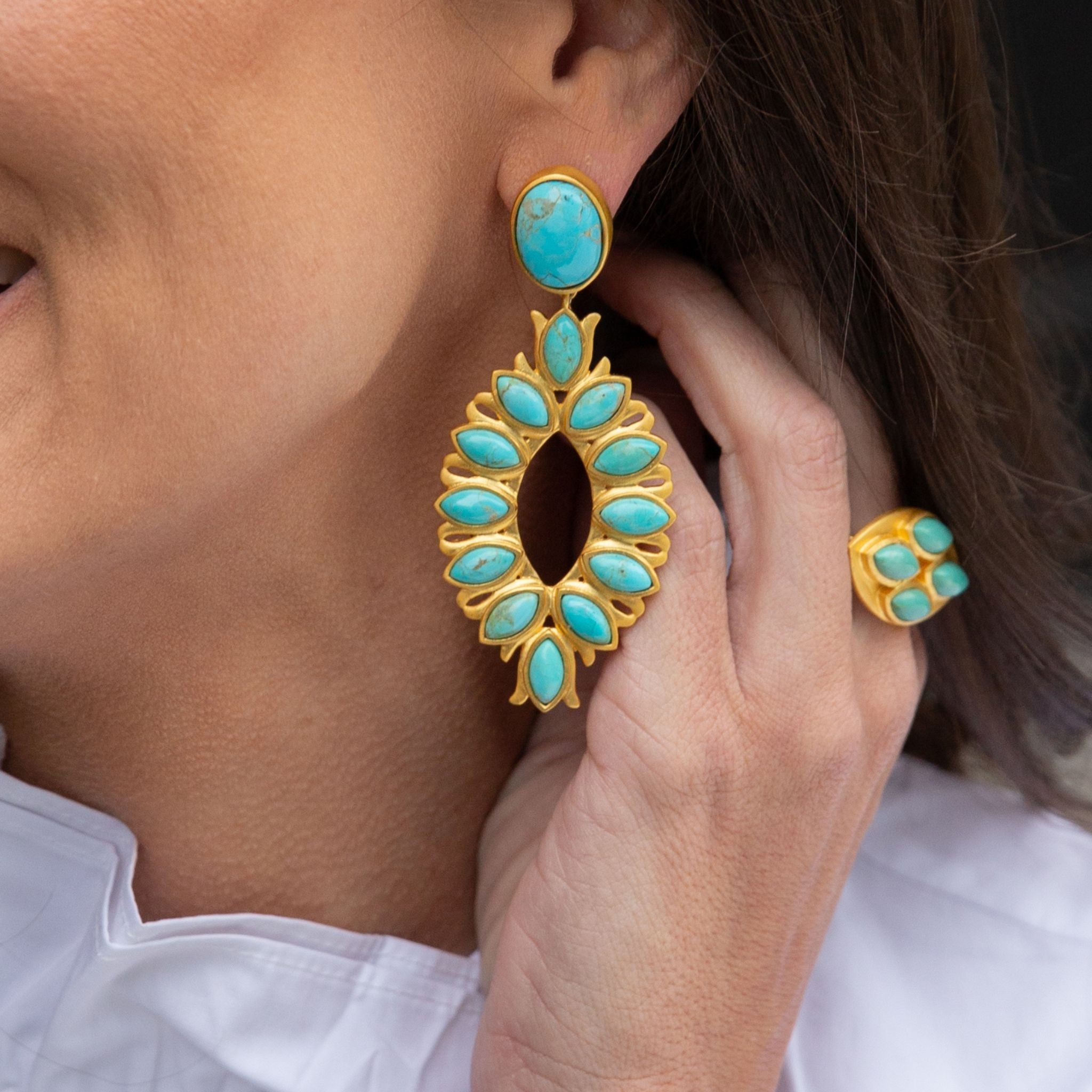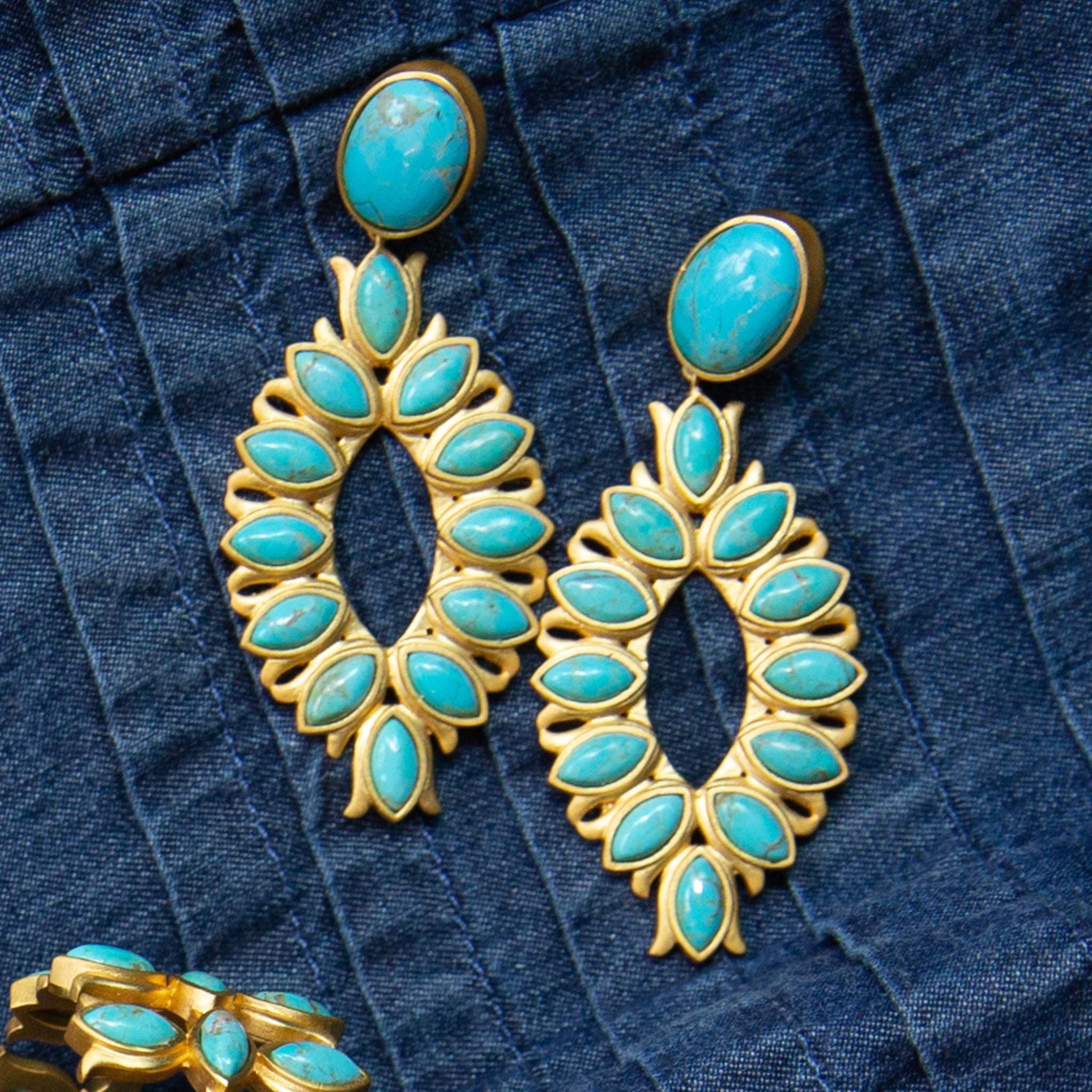 Infuse dreamy florals into your look with the Water Lily Drop Earrings in turquoise. These statement earrings feature a fixed oval-shaped stone stud on a post back with a hanging open-center chandelier. The center-piece of the earring is adorned by petal-shaped turquoise stones in flower settings. Crafted from 18K gold-plated brass, this statement earring is nickel-free and hypoallergenic. Pair this turquoise drop earring with the Water Lily Cuff and Iris Ring for a complete look. These earrings are also available in green strawberry quartz.