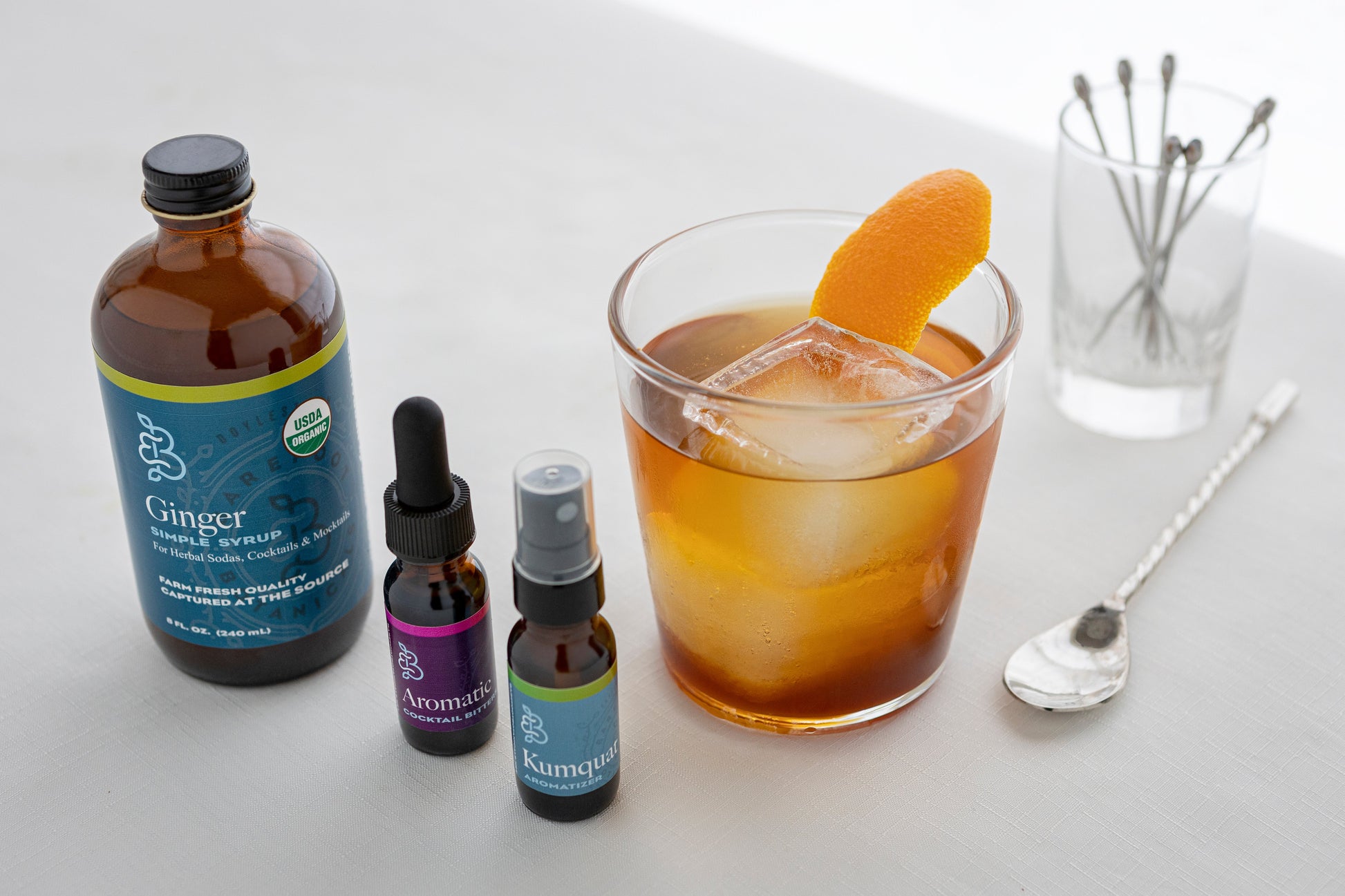 Our botanical extracts of Ginger, Aromatic Bitters, and Kumquat are combined with Revivalist Botanical Whiskey (or whiskey of your choice) and large format ice cube for a great Old Fashioned with a botanical twist