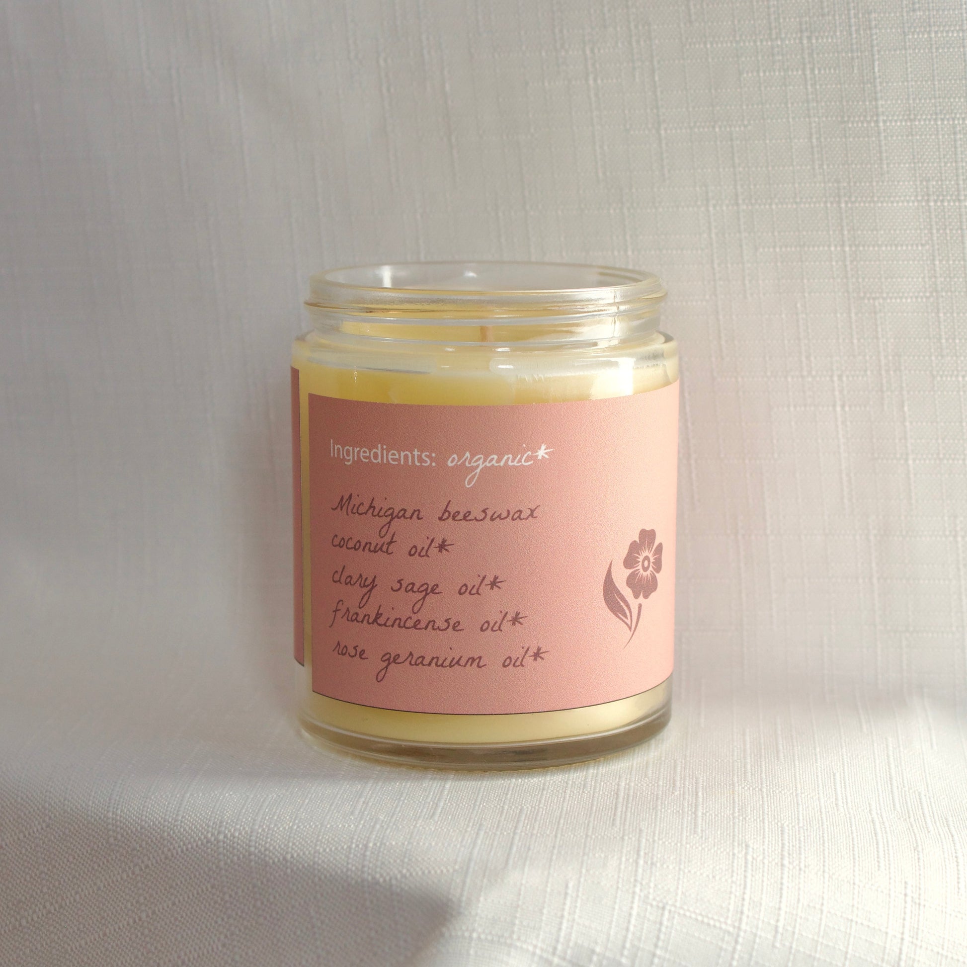 Local Michigan beeswax (Apis Mellifeca), organic coconut oil (Cocus Nucifera), organic clary sage essential oil (Salvia sclarea), organic frankincense essential oil (Boswellia carteri Birdw.), and rose geranium essential oil (Pelargonium graveolens L'Hér).