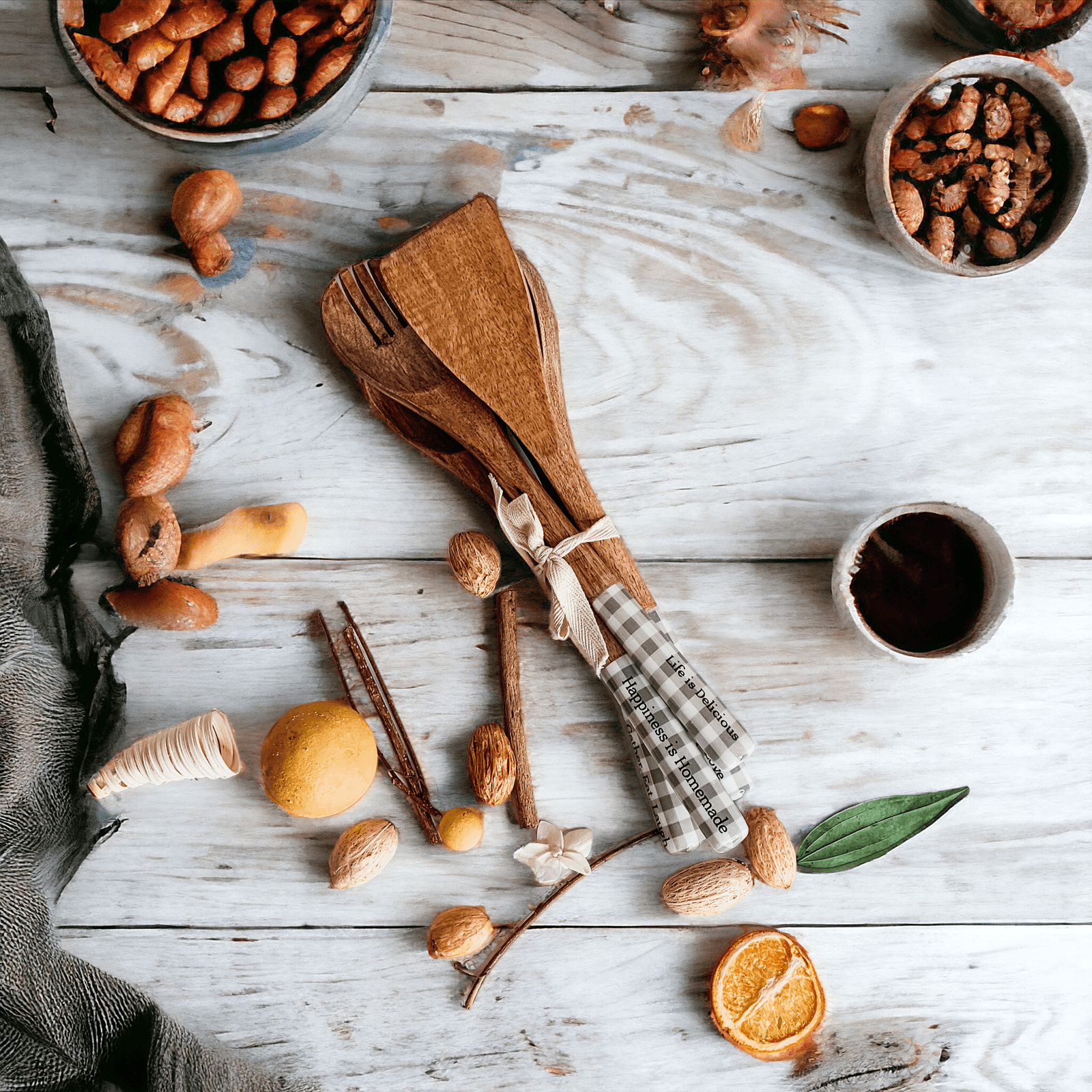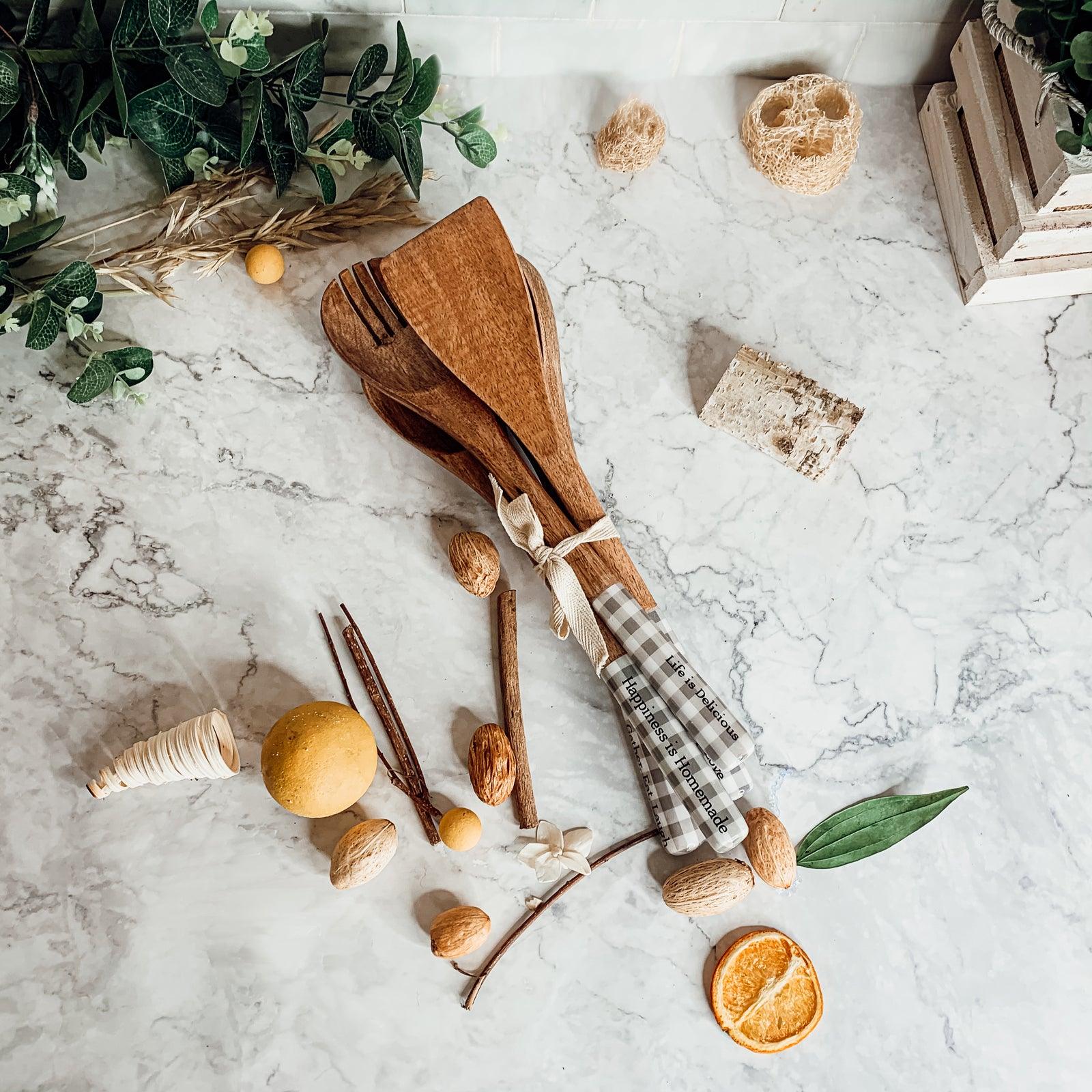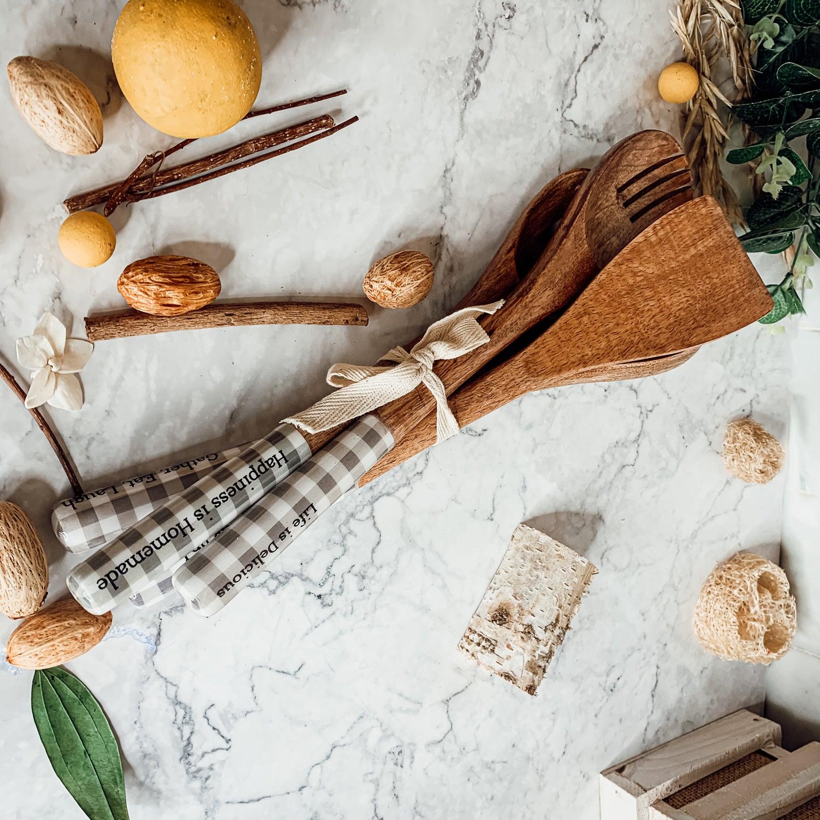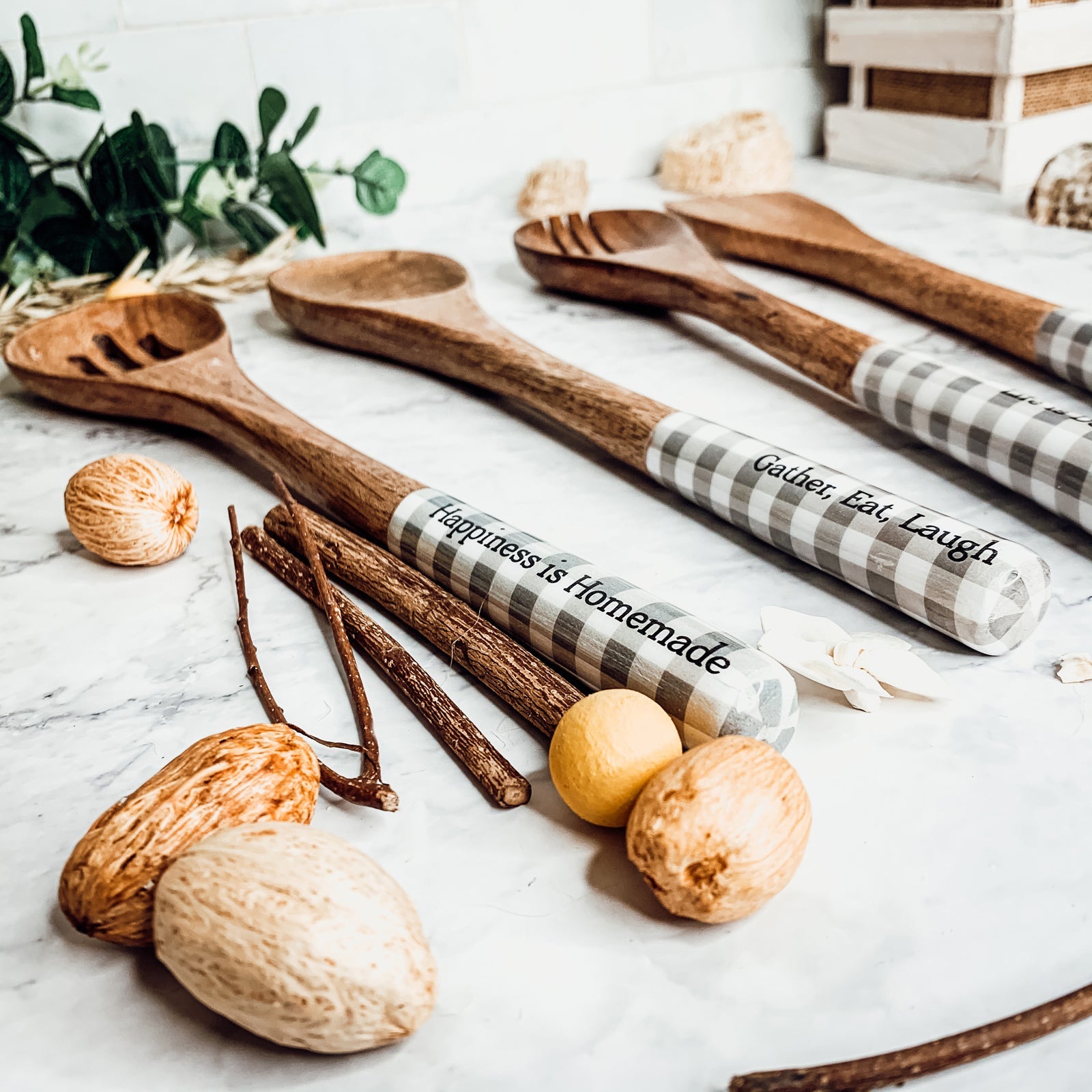 Each utensil of our Happiness is Homemade set is engraved with a happy saying. Set includes Solid spoon, serving fork, solid turner and slotted spoon.